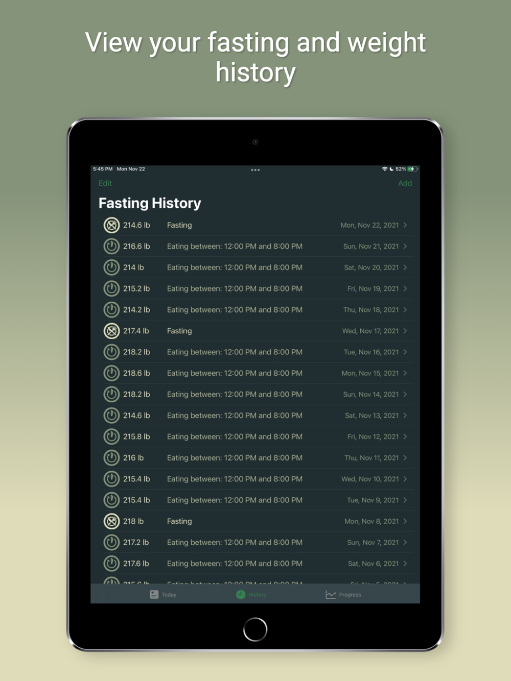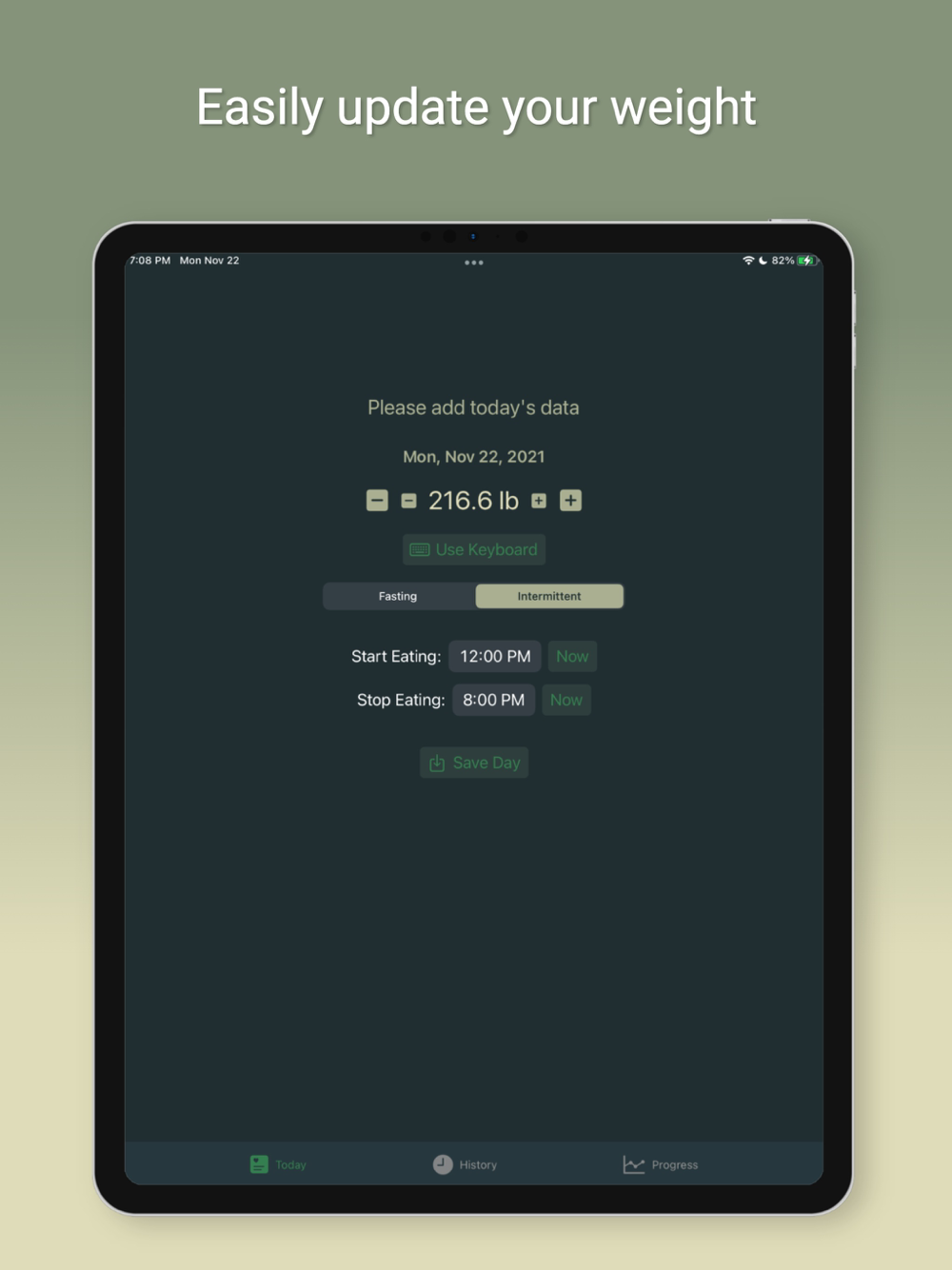 Fasty: the Fasting Tracker helps you track your weight, the days you fast, and when you eat on non-fasting days (intermittent fasting).