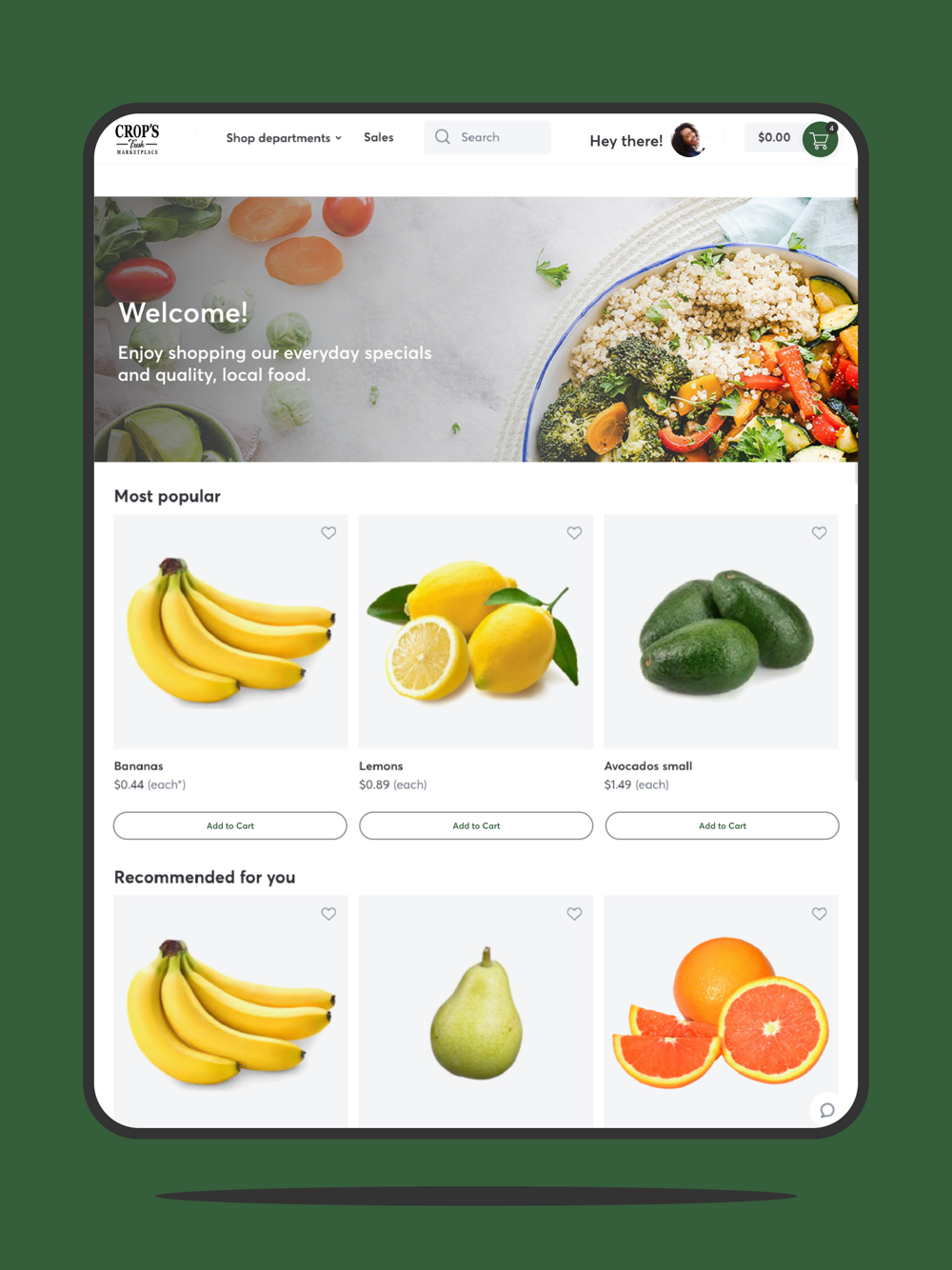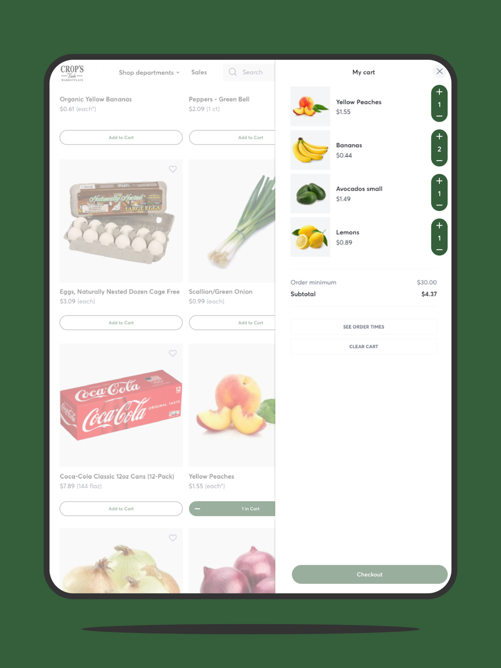 Use the Crop’s Fresh Marketplace ecommerce app to shop for same day delivery or in-store pickup! Simply make an account, pick your favorite items, and choose a time to receive your groceries. Shop from your mobile phone at the local grocery store you know and trust.