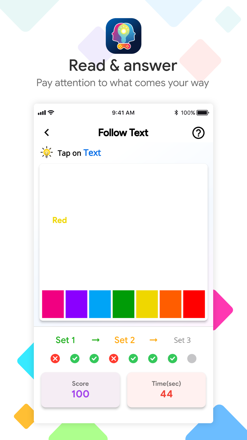 7. Follow Text = Enhance visual attention by hitting the correct colour according to text.