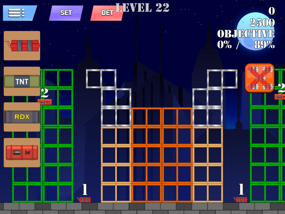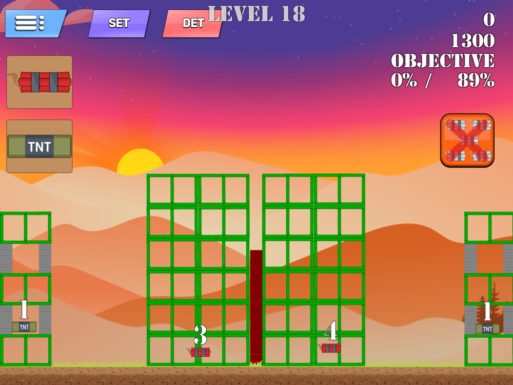 After placing explosives during the 'Set Phase' you can select four triggers to detonate them during the 'Det Phase'. Strategic thinking and impeccable timing are crucial as you try to avoid collateral damage while completing each level’s objective and maintaining a positive score.