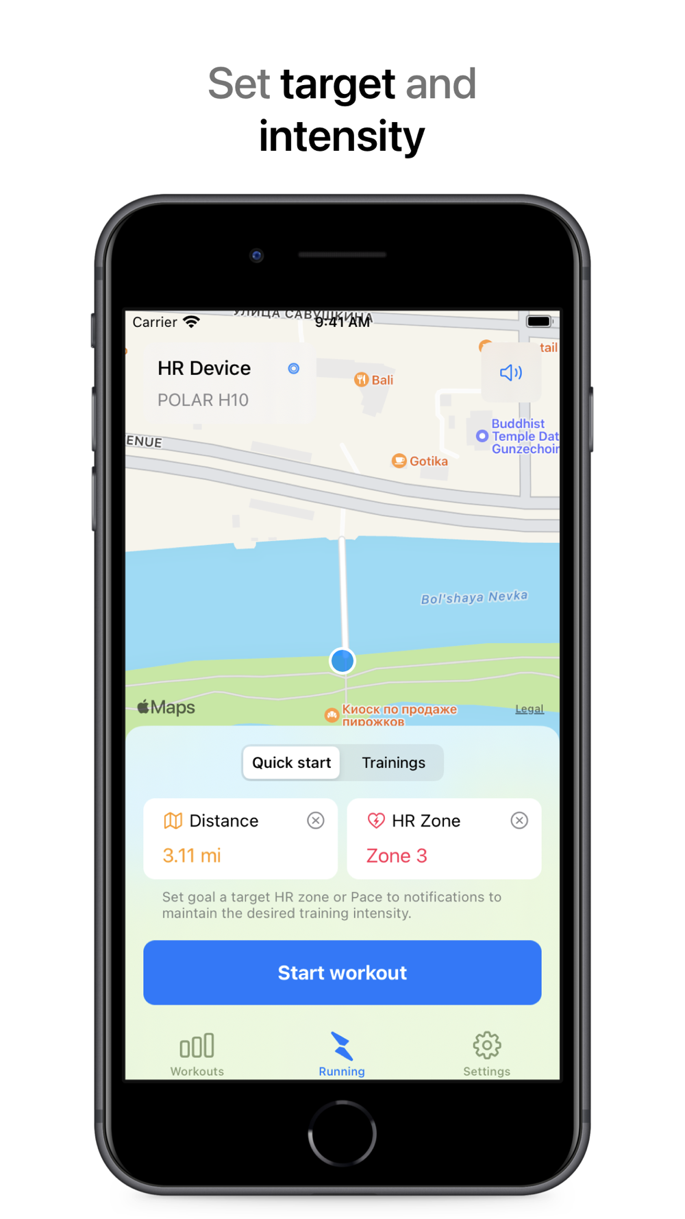 The app will collect all the statistics: GPS route, pace, heart rate and heart rate zone, elevation, calories. In the process of running Pro Runner will notify you with an audible signal about going beyond the set intensity, as well as about achieving the goal.