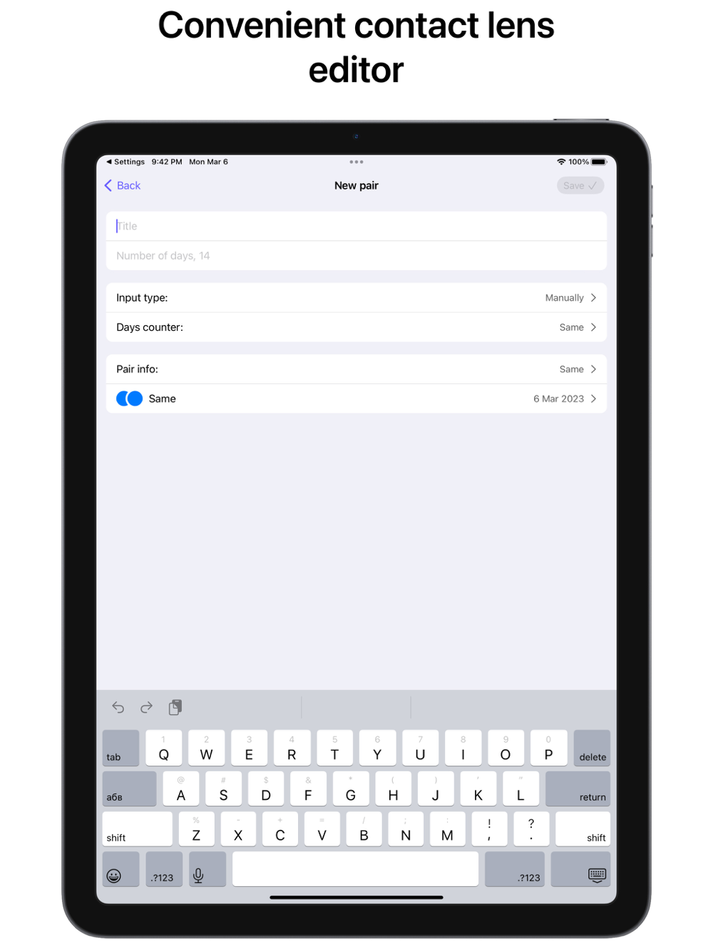 -Store unlimited pairs of contact lenses and keep track of all on one screen;