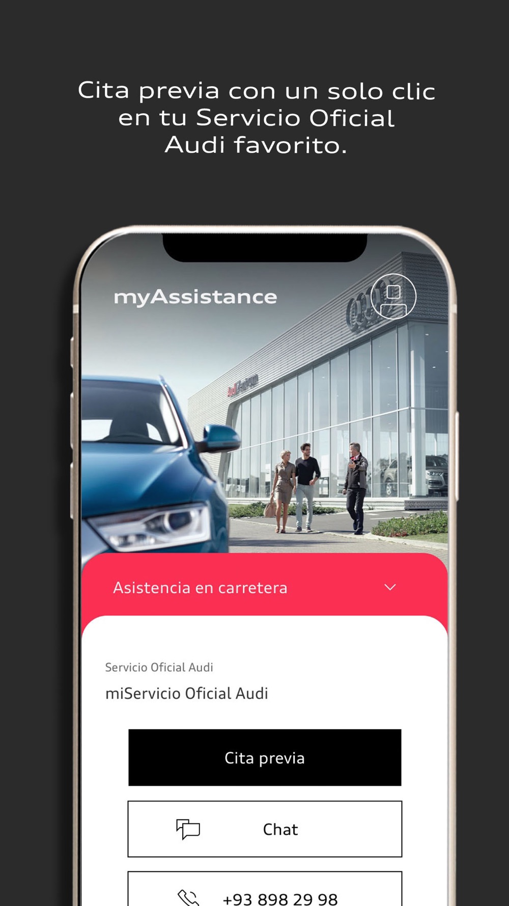 myAssistance: Ponemos a tu disposición en un solo clic la posibilidad de reservar cita previa en tu Servicio Oficial Audi favorito. Además, también podrás contactar con él y disponer de un chat directo con los mejores expertos cómo y cuándo quieras. Y por supuesto, solicitar Asistencia en Carretera en el instante en que lo necesites y hacer un seguimiento de la grúa en tiempo real.