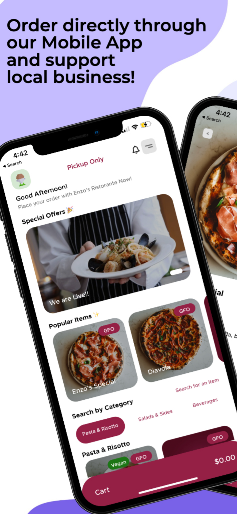 Download the Enzo's Ristorante App today to gain access to our full menu, order through the app, receive exclusive in-app discounts and gain reward points for each order to use on future purchases!