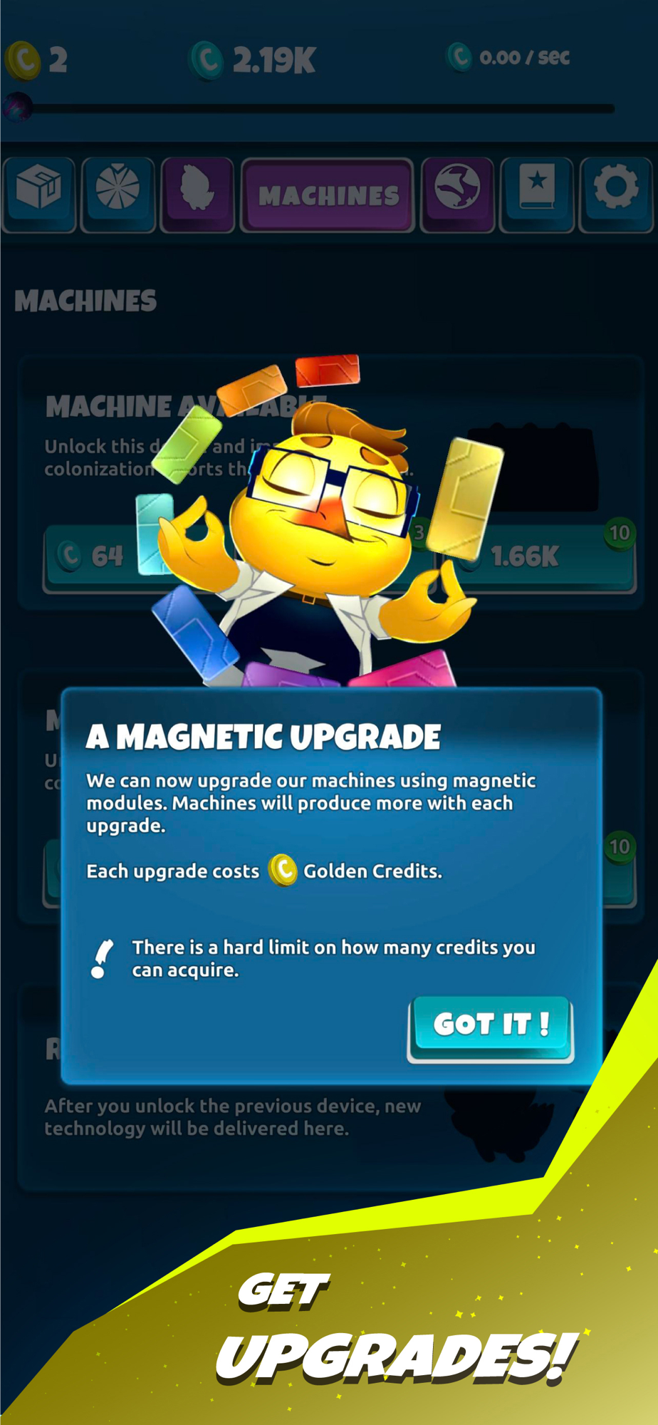 Tap your way, buy machines and discover the power of automation in an amazing idle game set in space! Help the Chikin (not to be confused with chicken) build space colonies, populate planets, and conquer Sector Alpha.