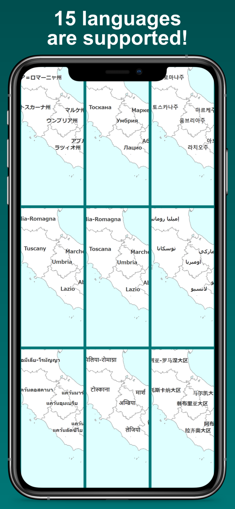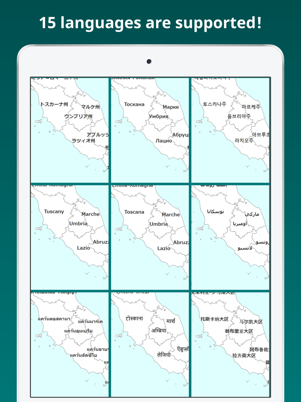 This app supports 15 languages: Italian, English, French, Spanish, German, Russian, Portuguese, Japanese, Chinese (Simplified), Chinese (Traditional), Korean, Arabic, Hindi, Thai and Vietnamese. The names of regions and provinces are displayed in their respective languages.