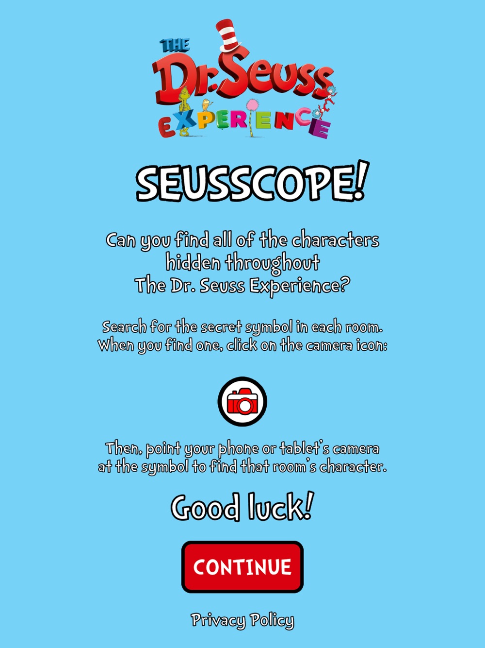 The Dr. Seuss Experience Seusscope app is the official augmented reality companion app to the Dr. Seuss Experience. Use this application to complete the Character Quest, and discover the seven hidden characters found in rooms of the Dr. Seuss Experience.