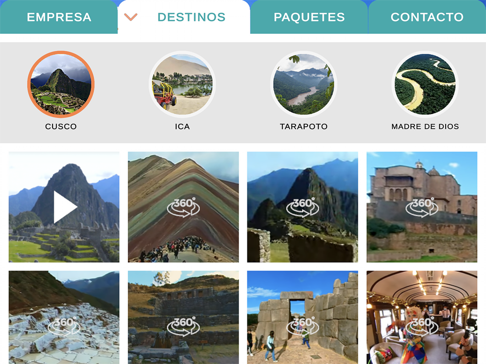 Aplicación para agencia de viajes Mundo Viajero, que incluye recorridos por 4 puntos del Perú: Puerto Maldonado, Cusco, Ica/Paracas y Tarapoto.