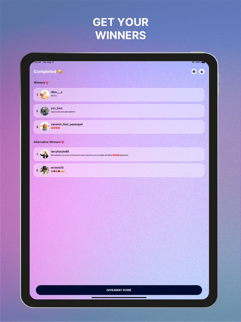 ONLY in a few minutes, you can make random raffles for your next Instagram giveaway. Set the giveaway rules, and you’re ready to boost your followers on Instagram. Your giveaway winners will be ready only in a few seconds!