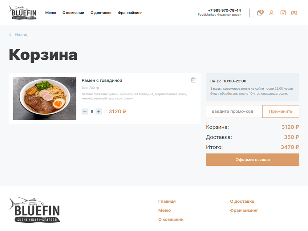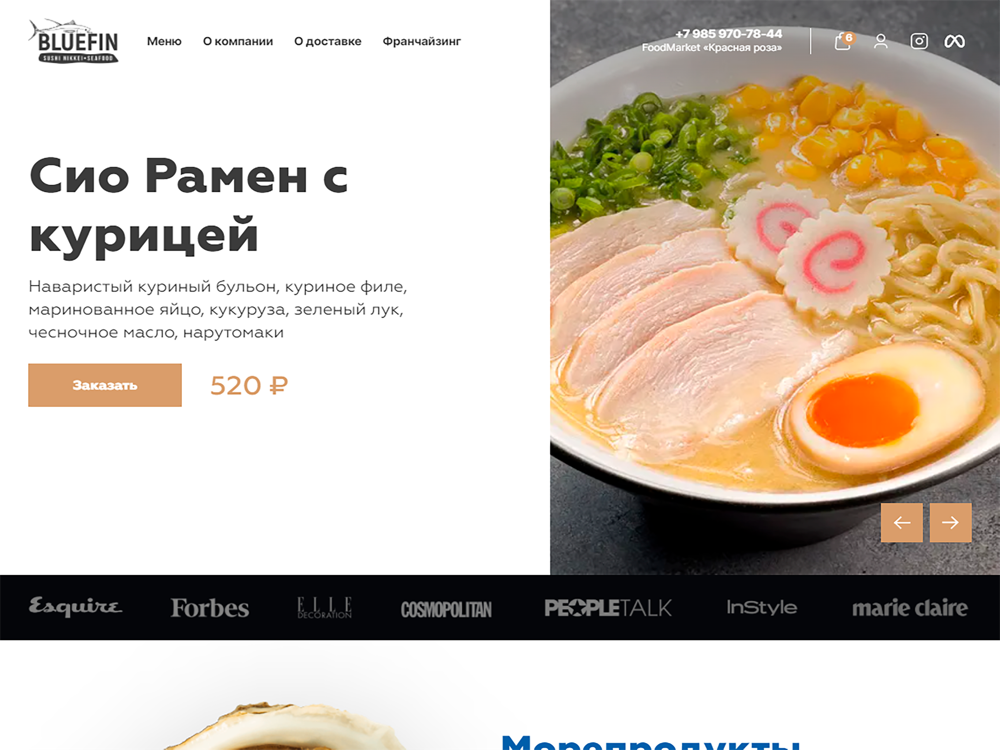В меню несколько видов сервированных устриц, большой выбор суши и роллов, блюда из брюшка тунца торо, икра морского ежа, лакедра и прочие морские деликатесы. Все заказы доставляются в уникальной дизайнерской упаковке.