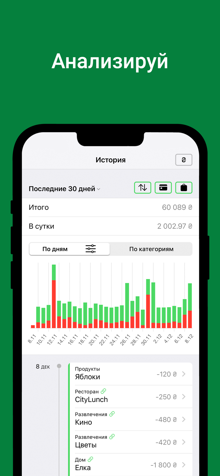 • Информативные графики покажут реальное состояние расходов и доходов по различным категориям.