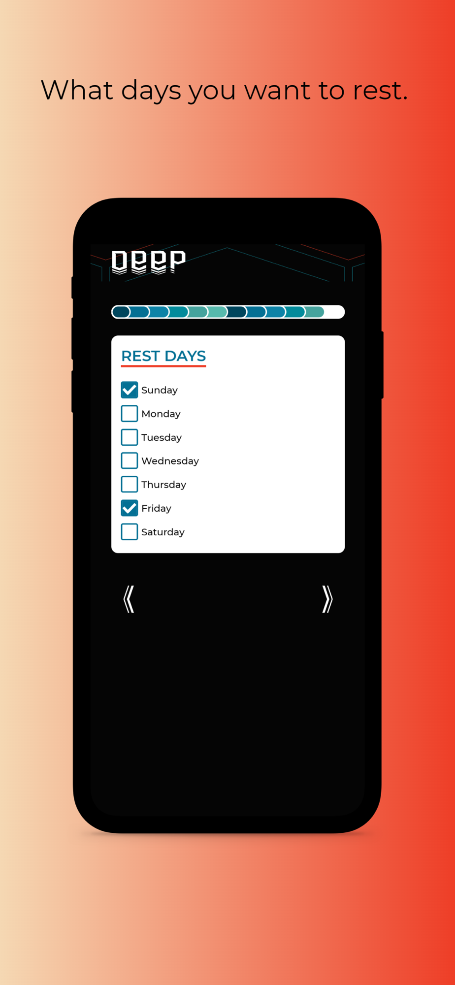 We start with some questions to help us understand where you are and where you want to go on your fitness journey. Maybe you’re looking for a short home workout with minimal equipment. Or you’re yearning for a daily two-hour long fitness odyssey that uses every piece of gear imaginable. Perhaps you’re new to working out and not even sure where to start. Then again, maybe you’re a grizzled veteran that’s been in and around gyms for years. Whatever the case, Deep can handle it. We’ll create your personalized workout program in seconds and you can begin using it immediately.