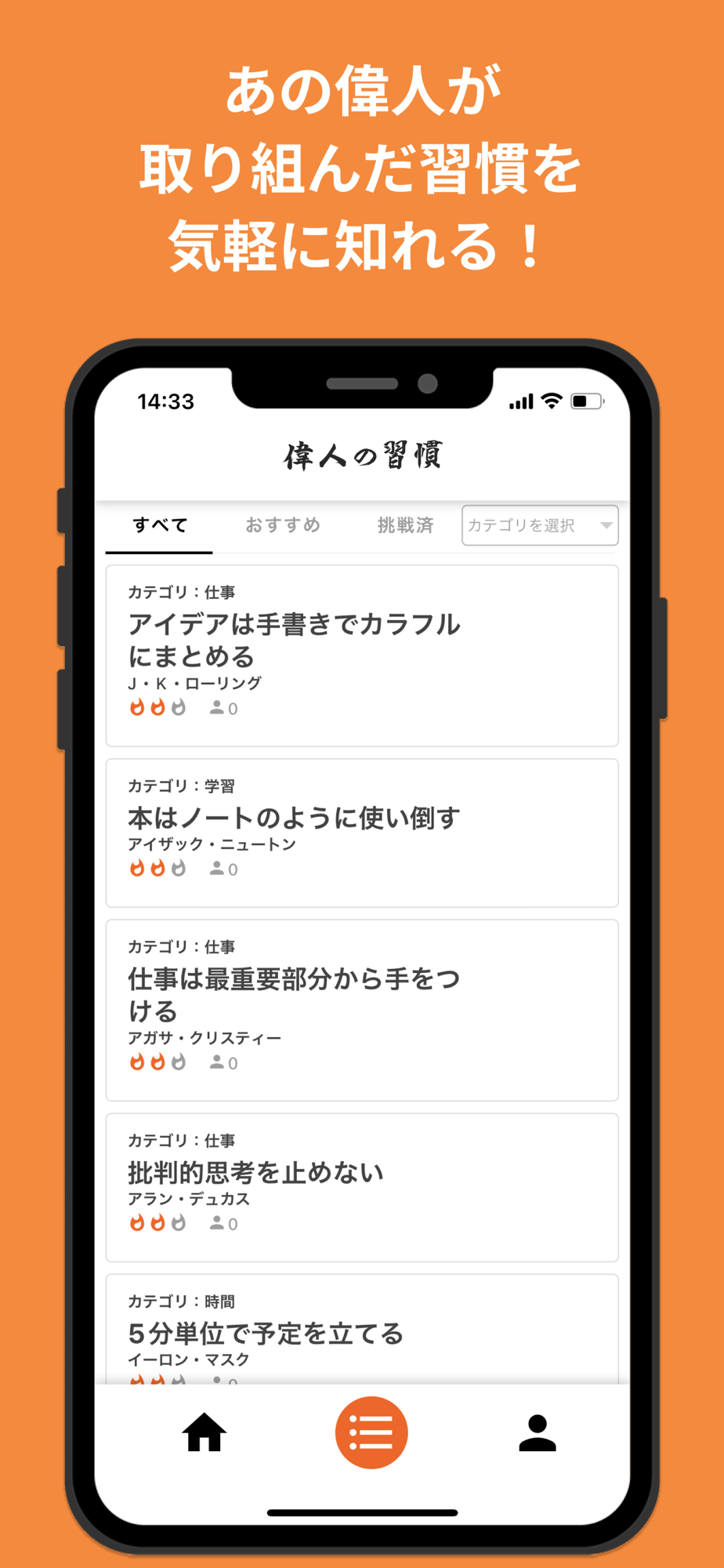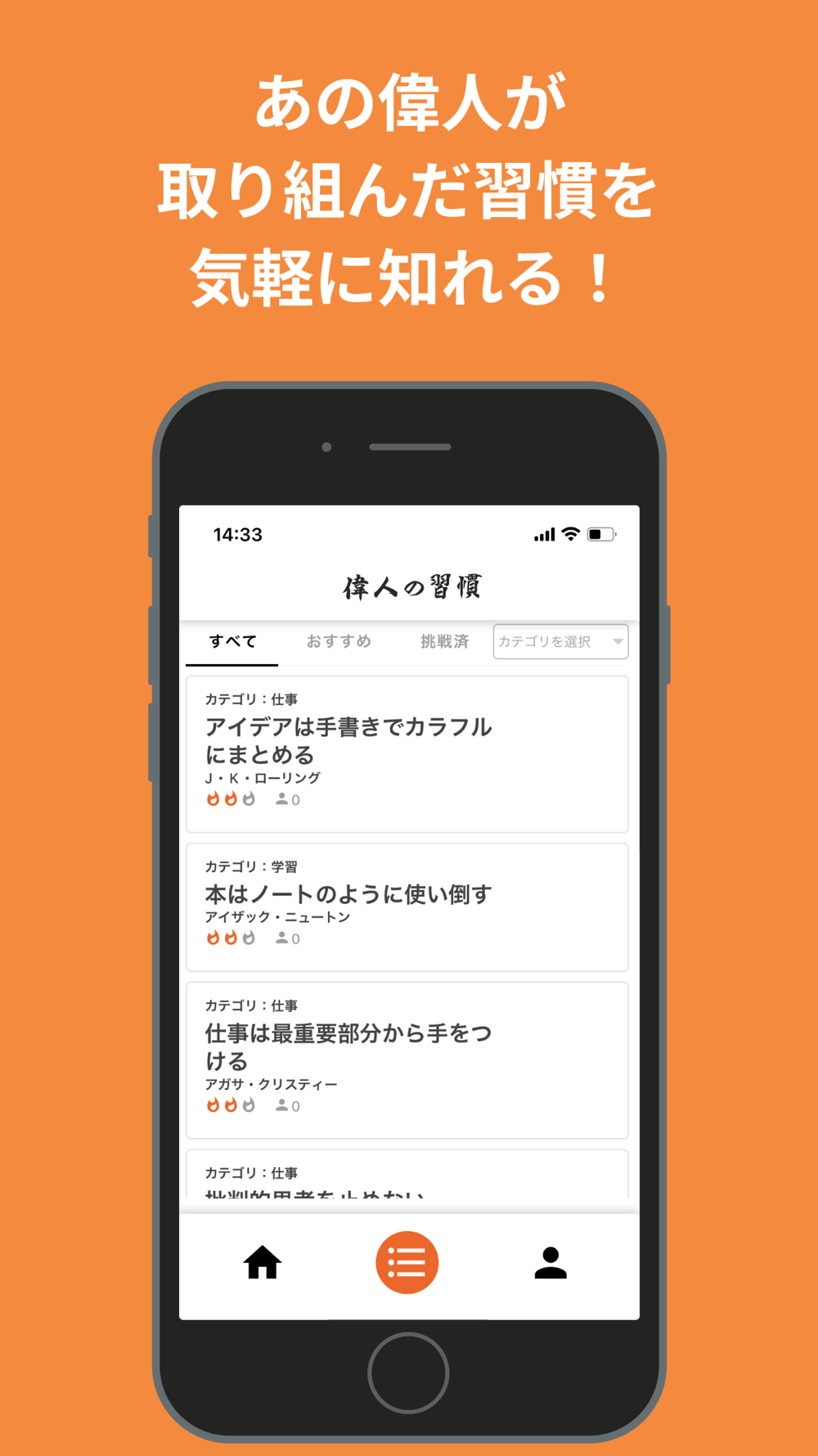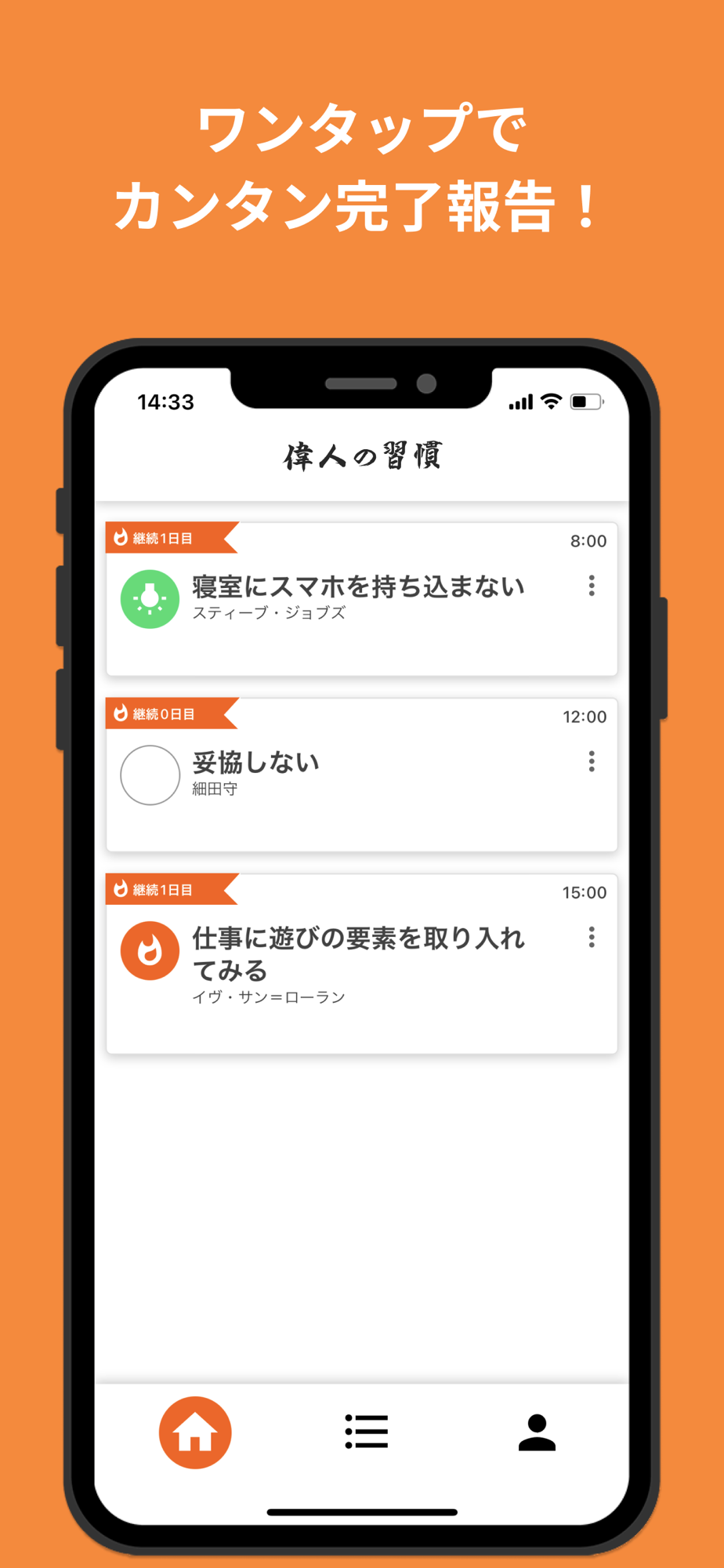 ① ワンタップでカンタンに偉人の習慣を知れる!、試せる!