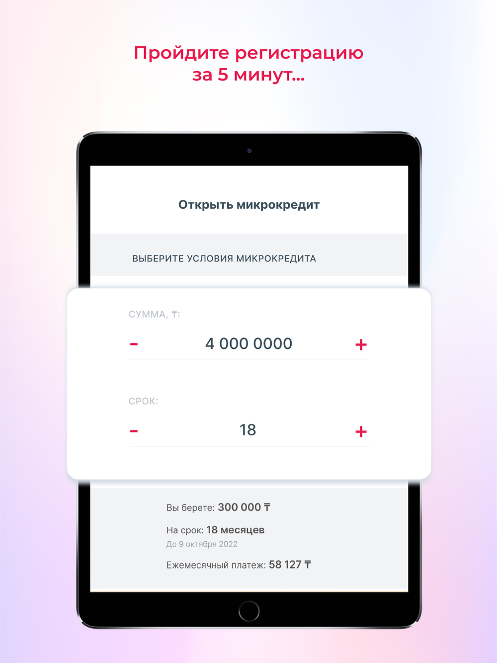 • Получите от 200 000₸ до 4 000 000₸ на срок от 6 месяцев до 5 лет