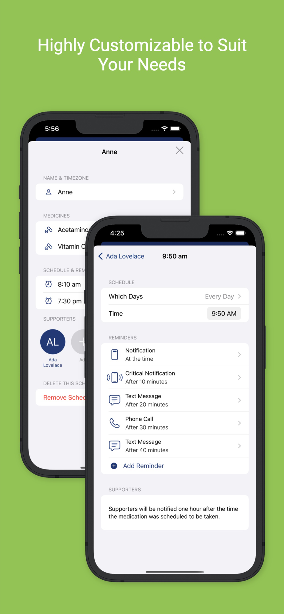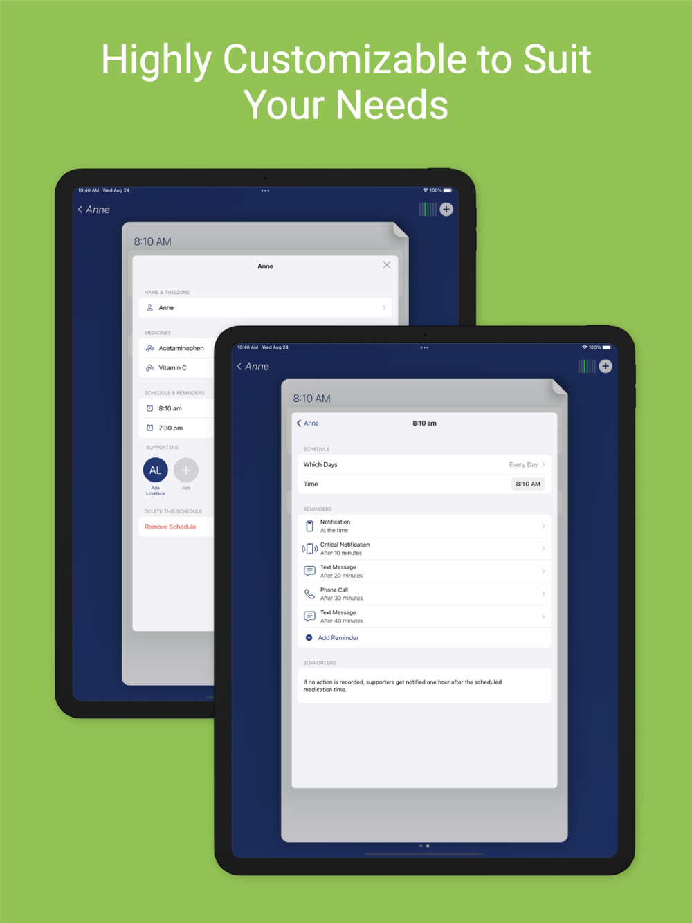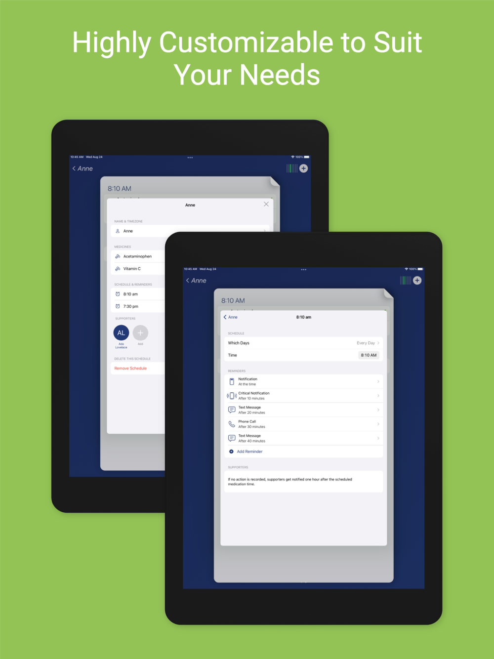 FULLY CUSTOMIZABLE means every feature can be adapted to your scenario … including reminder types, reminder frequency, escalation sequence, message content, supporter notifications, etc.