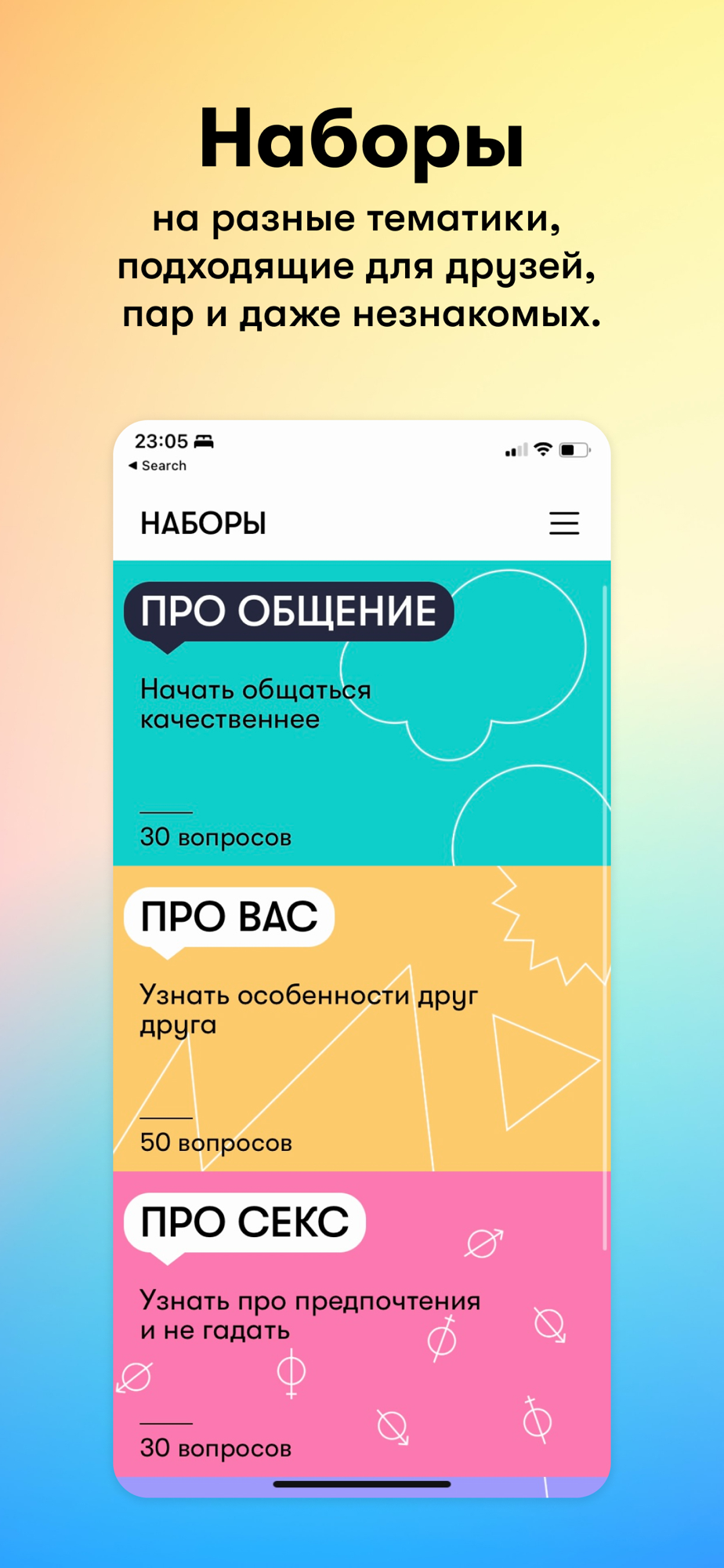 Наборы с вопросами для построения откровенного диалога. Это подходит для друзей, пар, компаний и даже незнакомых людей. Поможет сблизиться, узнать человека с другой стороны и границы в общении.