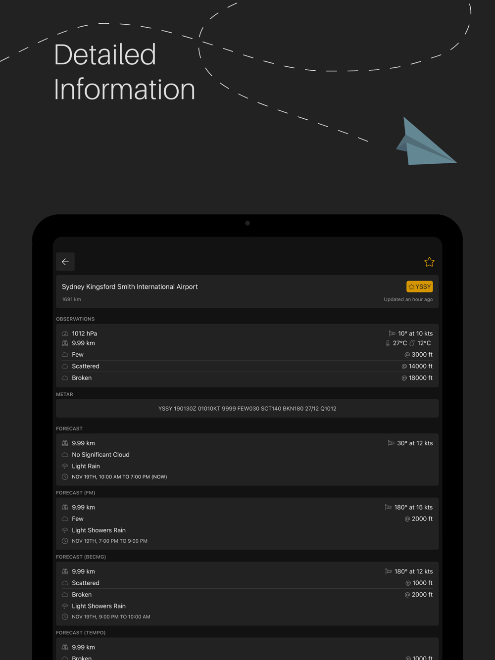 - View up to 50 nearby airports and their current weather observations and forecasts