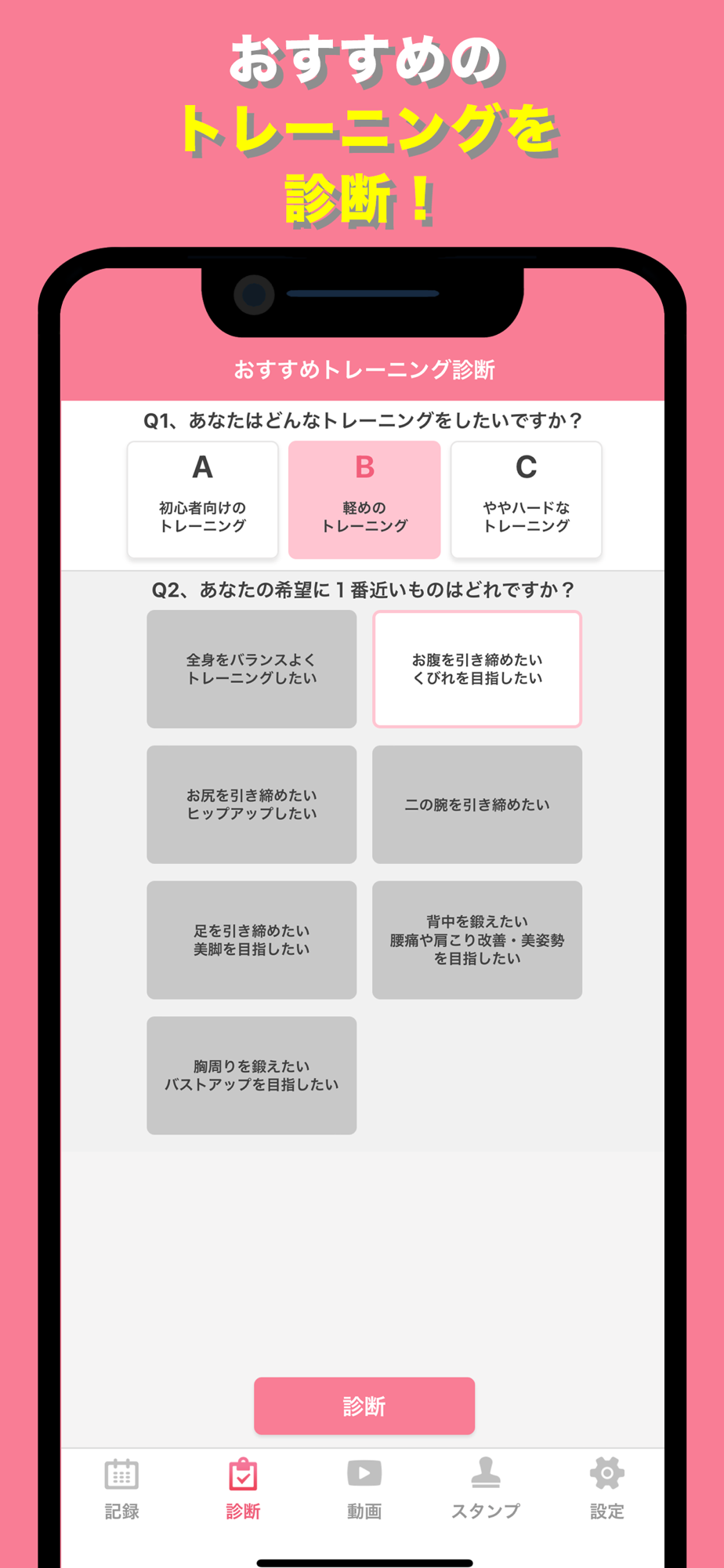お悩みの部分に合わせて、トレーニングメニューを提案する「おすすめトレーニング診断」も◎