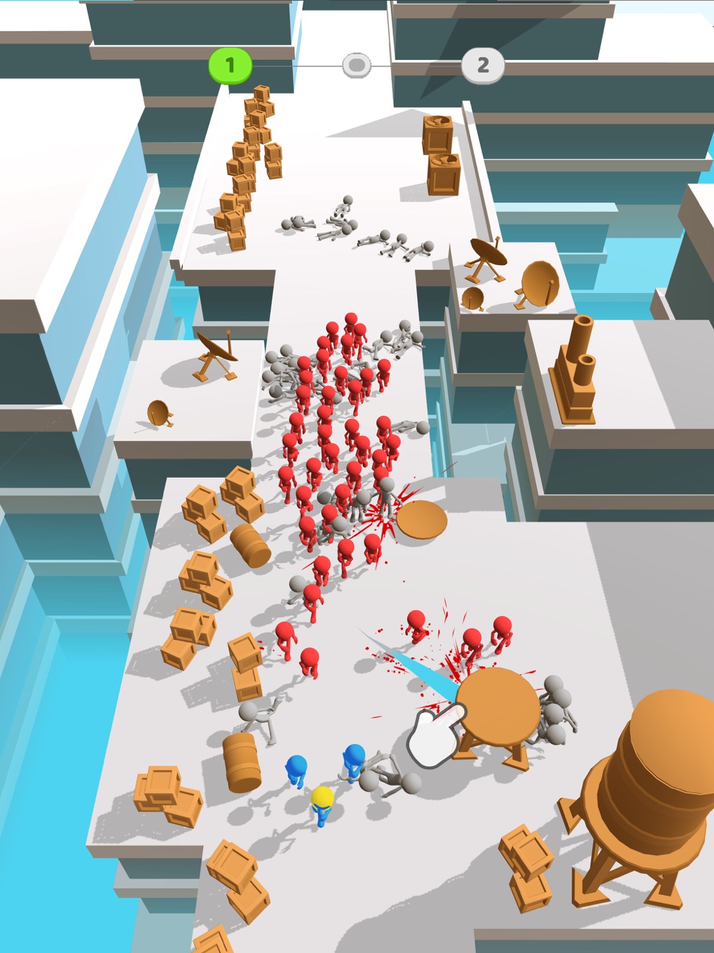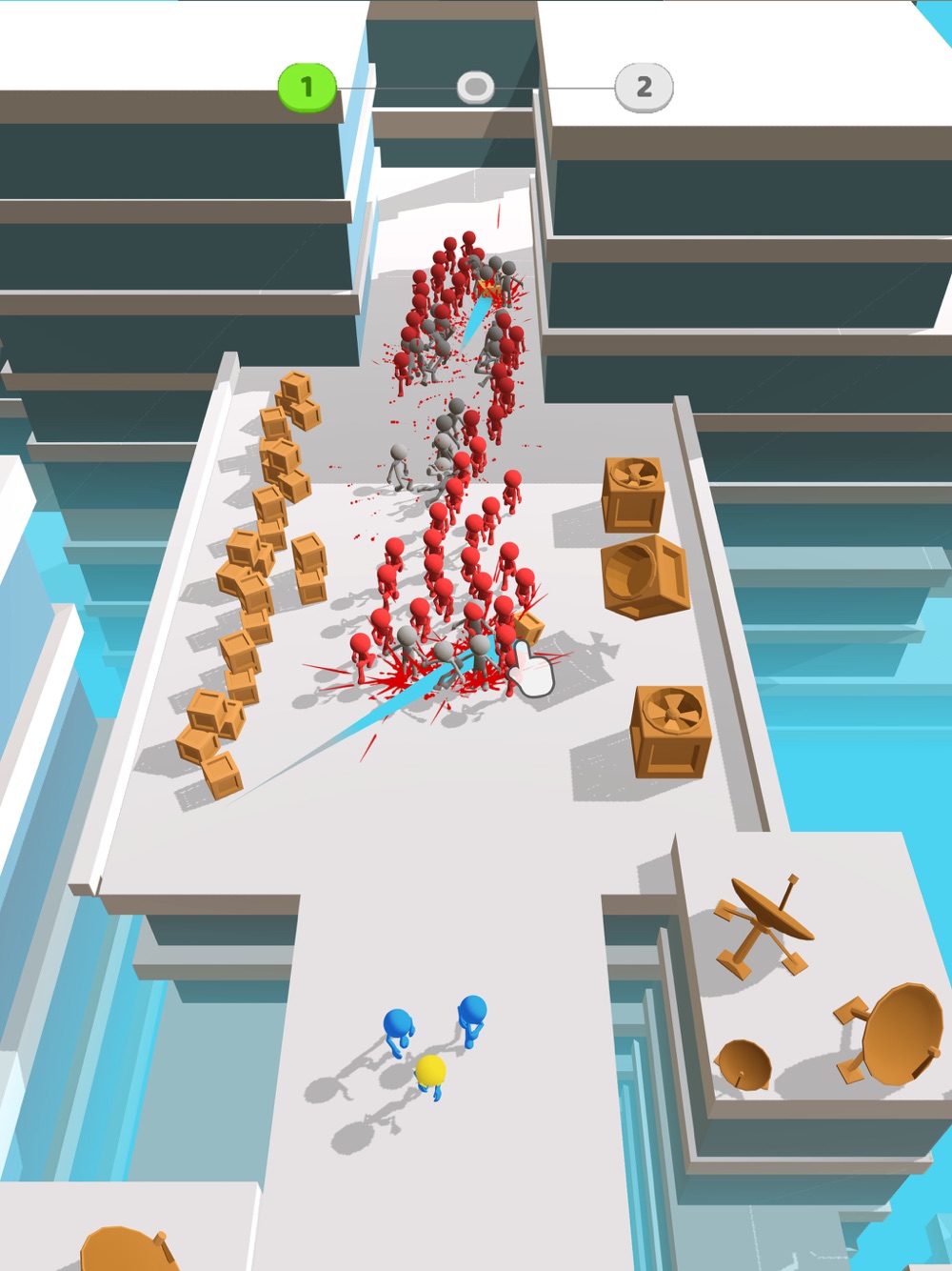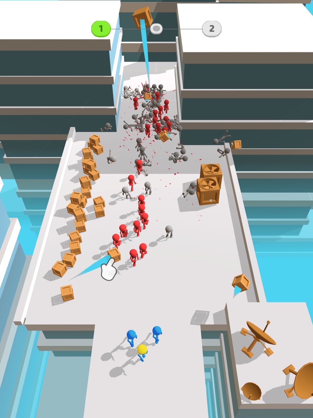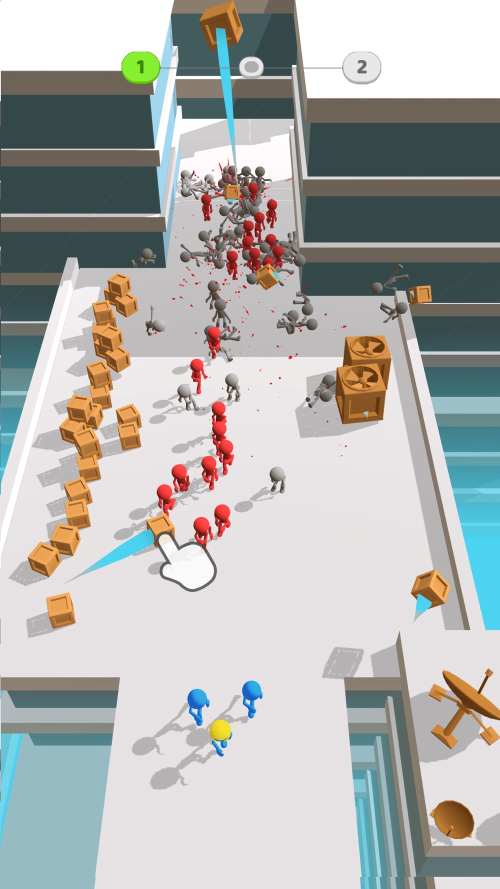 Help the little blue guys escape the hordes of red men by throwing objects of various sizes at them. Don't let them get your crew!