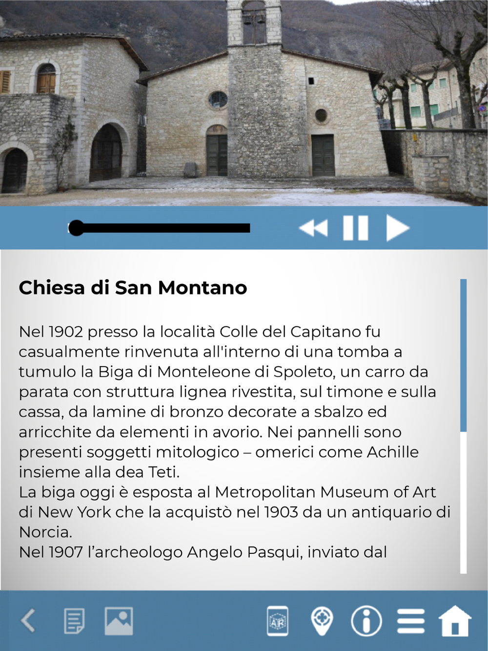 Se un punto di interesse o un bene culturale segnalato sarà nelle vicinanze allora l’APP automaticamente attiverà l’audioguida di quel punto e consentirà la consultazione della scheda monumento in modalità touchless. In basso è presente il pannello di controllo. Per consultare le schede degli attrattori culturali basta toccare il tasto MENU. Gli altri pulsanti attivano la REATÀ AUMENTATA (AR), permettono di accedere alla schermata MAPPA e consentono di riportare l’utente al pannello INFO.
