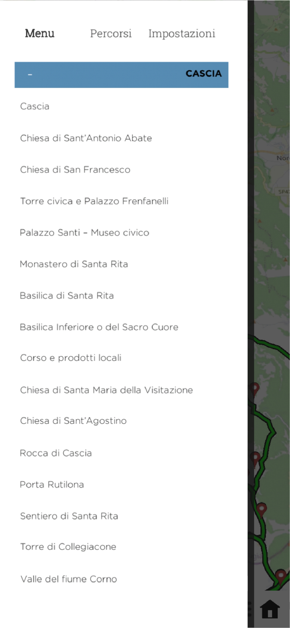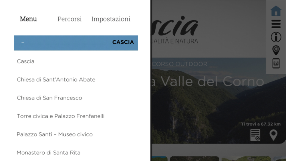 “Cascia tra spiritualità e natura” è una applicazione che sfrutta le funzioni del GPS, dell’Augmented Reality e del Bluetooth per dare al turista una esperienza unica e coinvolgente di visita del patrimonio culturale e naturalistico del territorio di Cascia.