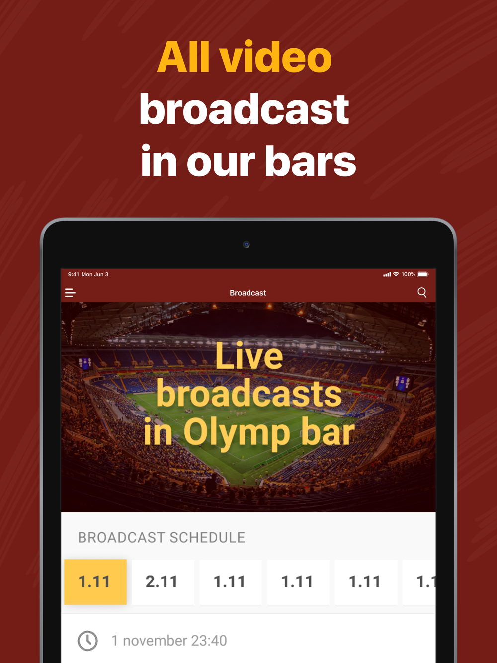 Our app won’t let you worry about missing important matches of your favorite team. With olimp you always check schedule today's matches.