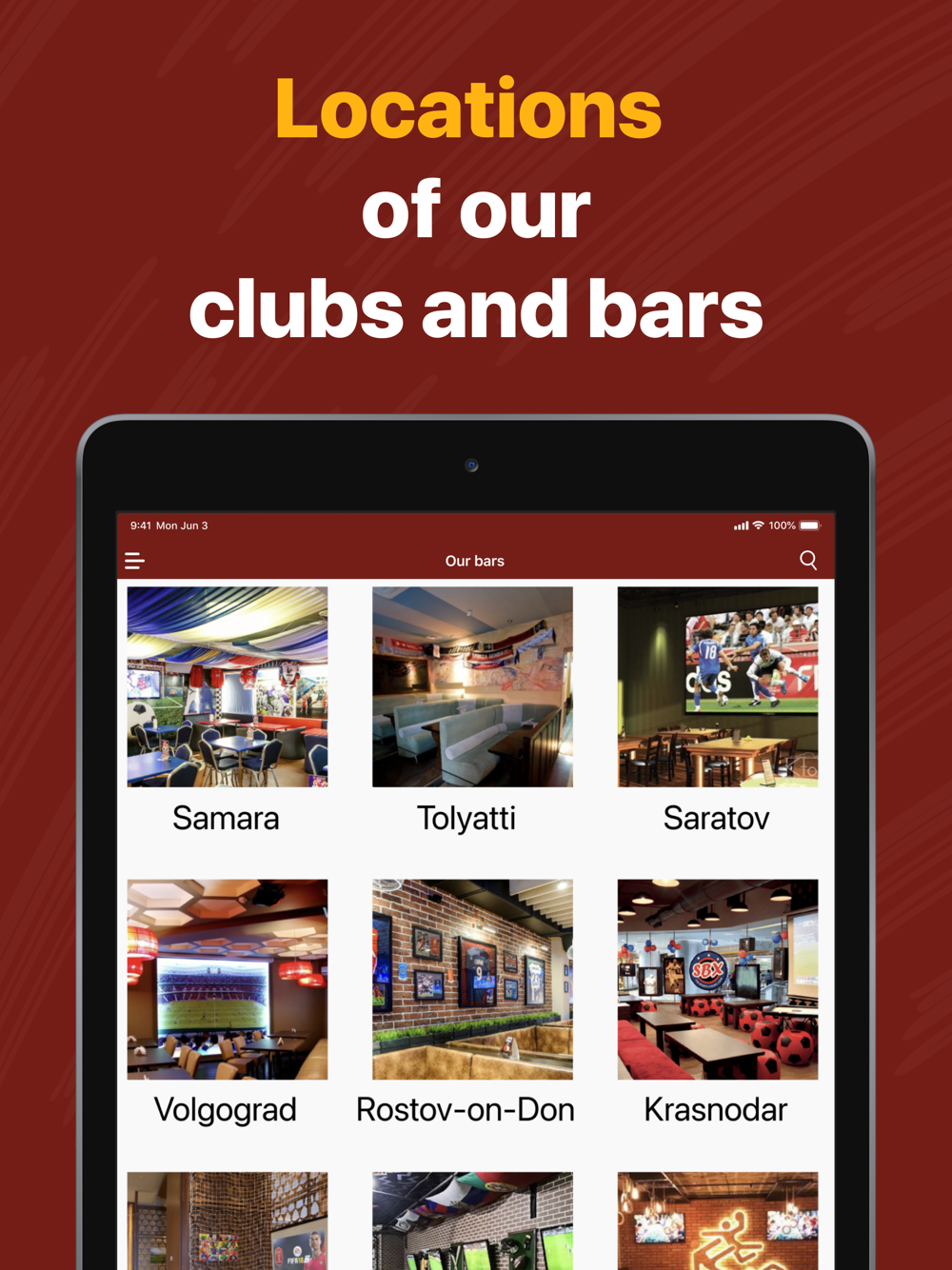 With our app you may find our restaurants and bars around Europe. It allows you to see schedule of video broadcast in our bars and restaurants.