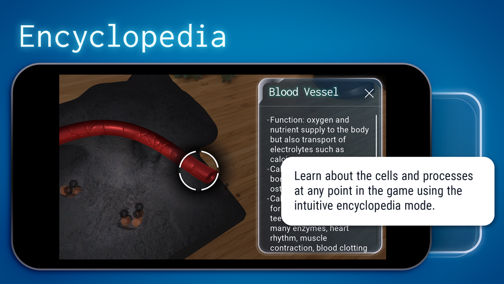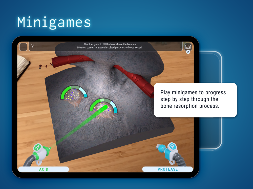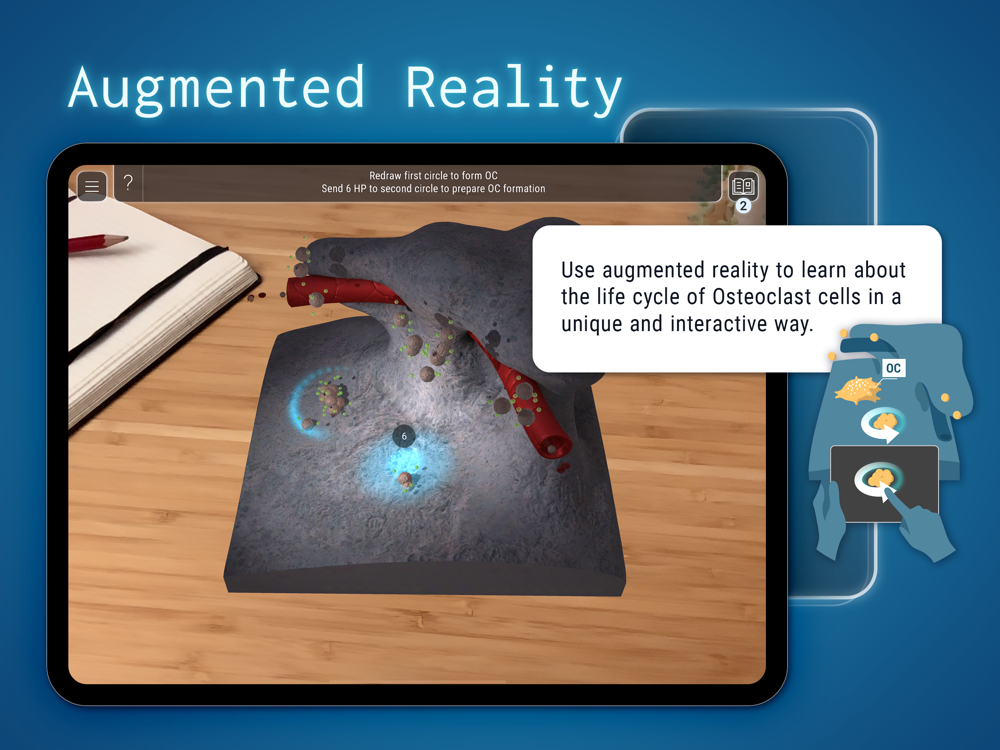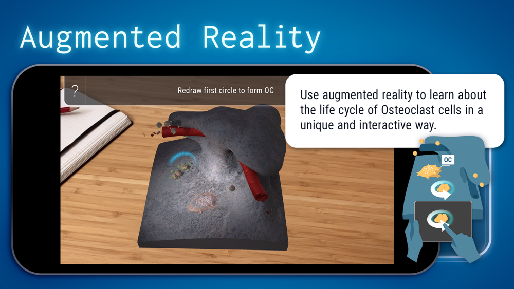 This app accompanies the book “Cell-to-Cell Communication: Cell Atlas – Visual Biology in Oral Medicine” and allows the user to experience the process of bone resorption in augmented reality. AR Osteoclasts draws you into the microcosm of osteoclasts right above the bone surface. In the augmented display, you are zoomed in to the level at which an osteoclast precursor cell appears to be the size of a hand. You investigate the bone resorption process from all sides by moving around the augmented display on top of your book page and you interact with cells to learn more about their function.