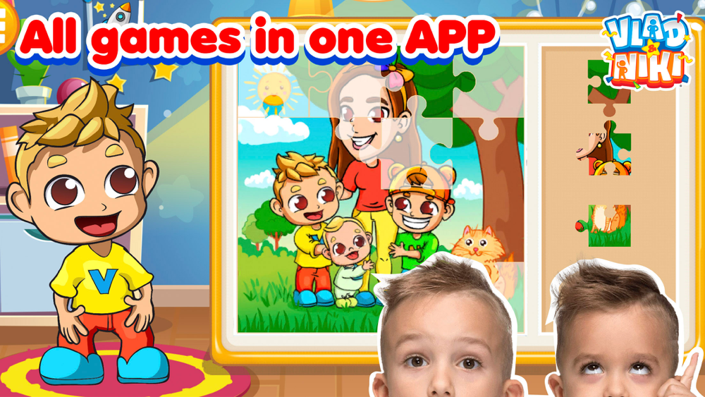 There is always something to do in Vlad and Niki's universe. In one application you can become a brave racer and a cool musician! Create a unique drawing and assemble a fun puzzle! Develop and have fun with us!