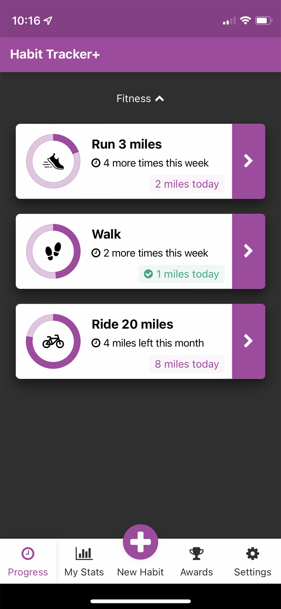 Turning activities into a habit is easy with Habit Tracker+. Simply add your new habit, create a schedule and be reminded each to track your results. After 2 weeks your activity turns into a habit. After 90 days your habit turns into a positive lifestyle change.
