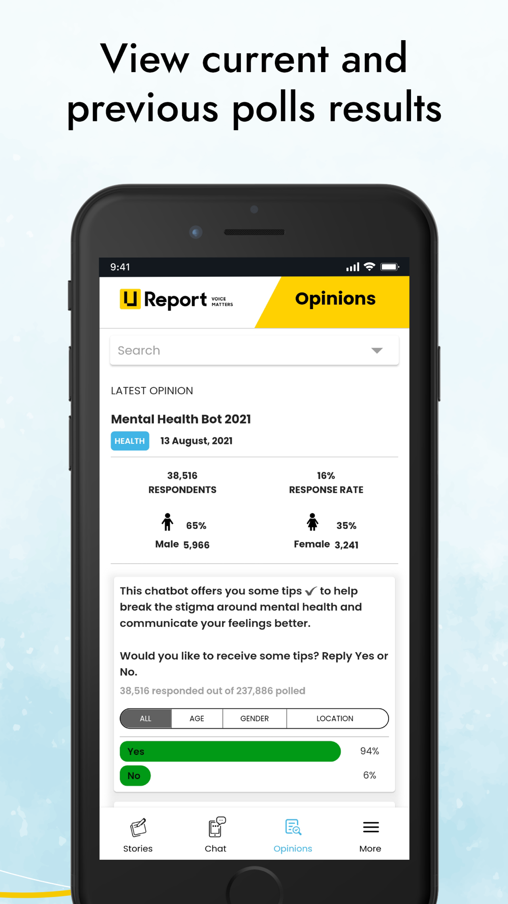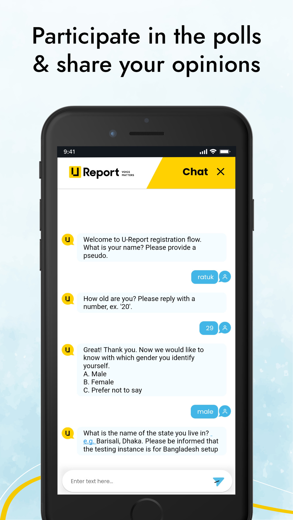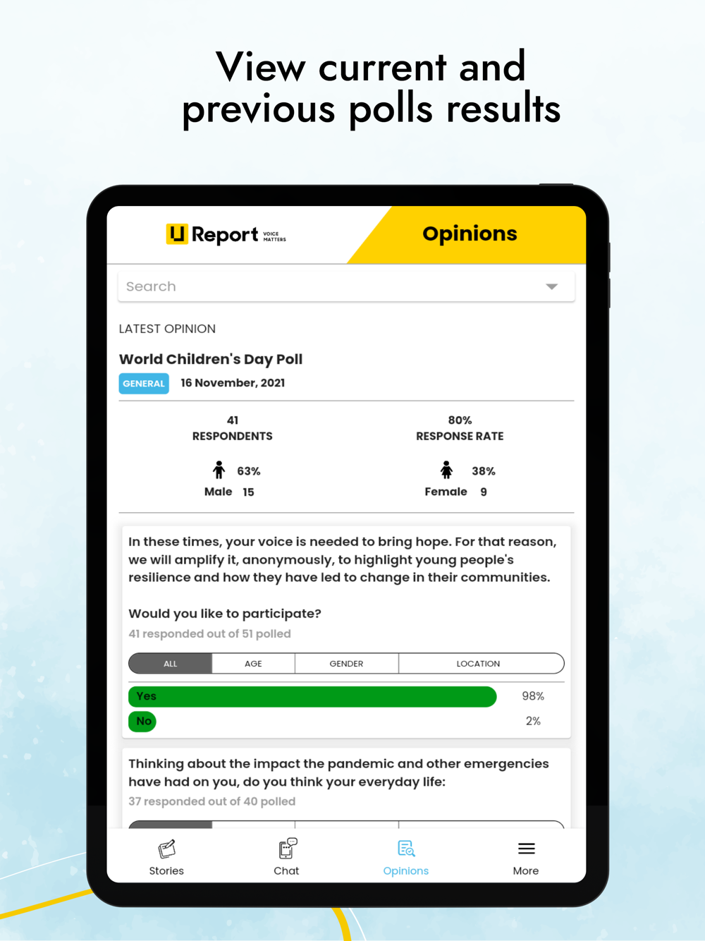 U-Report is UNICEF's flagship digital platform to engage young people and amplify their voice to inform policy and programme priorities, support emergency response and enhance advocacy actions in issues that are important for young people. It is a messaging programme for adolescent, youth, and community participation; and a key tool to share information, raise awareness, and collect quantifiable data on specific areas that impact children, including the most vulnerable. The U-Report Mobile App allows you to connect to millions of young people that are already raising their voices through interactive conversations with U-Report.
