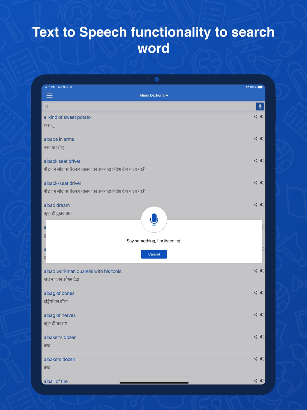 2- In Hindi Dictionary: Translator app, Users can search the word by their voice and read word meaning in both Hindi and English.