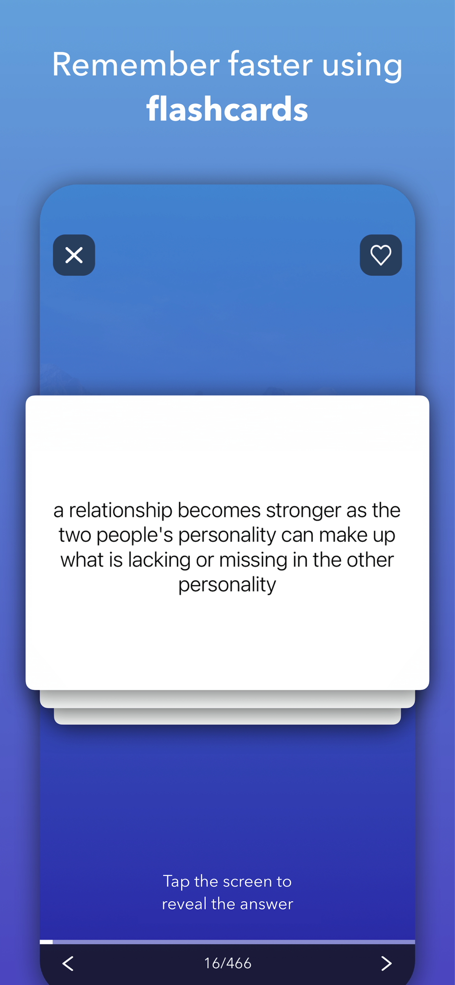 Swipe the cards to quickly review NCE concepts without the need to go through the whole test, complete the right amount of questions for you, and get some quick studying in.