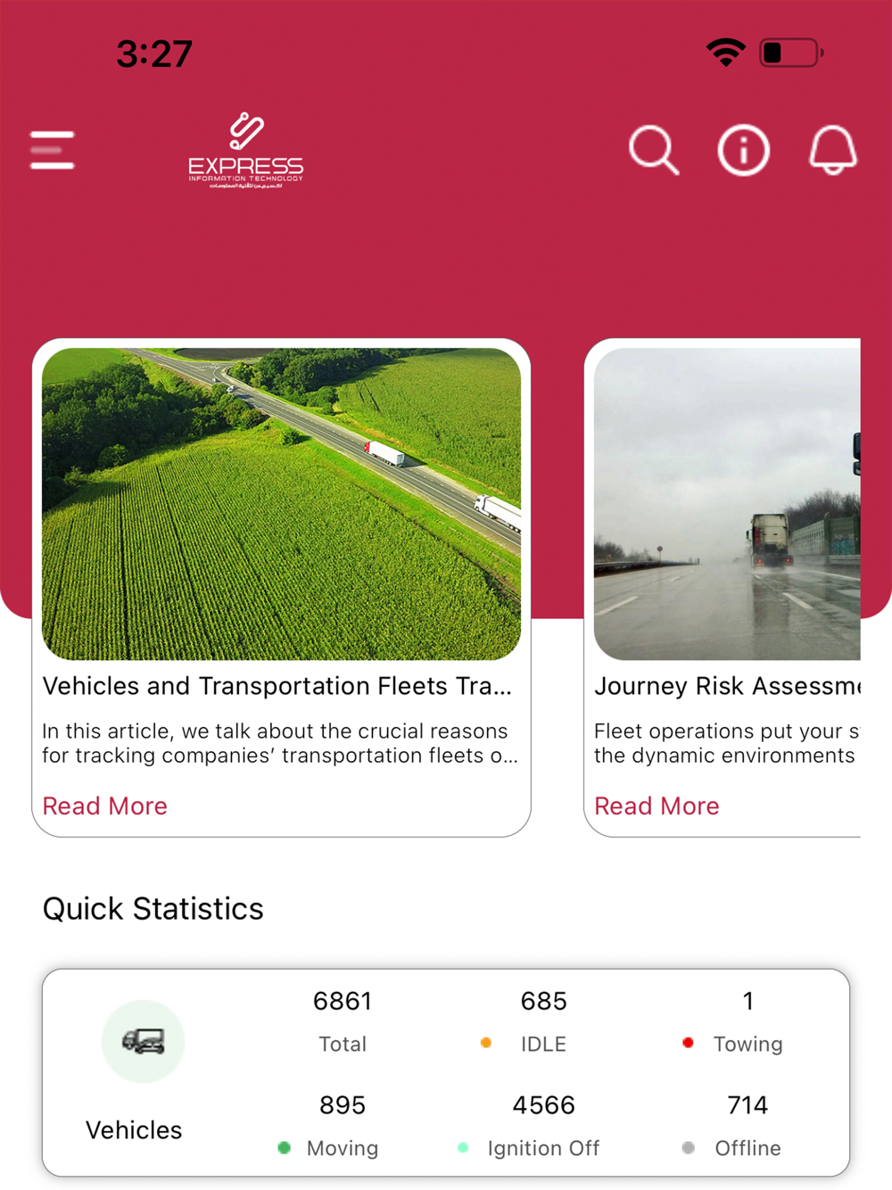 Express-IT app is a fleet management platform that allows fleet admins to monitor, get notified, manage, and build profound reports about their assets. Express-IT mobile application has come to increase the accessibility of users to their assets. The app lets the users to accomplish wide range of functionalities on their assets passively. They can build a subset of reports, monitor, and get notified through user-defined push notifications.