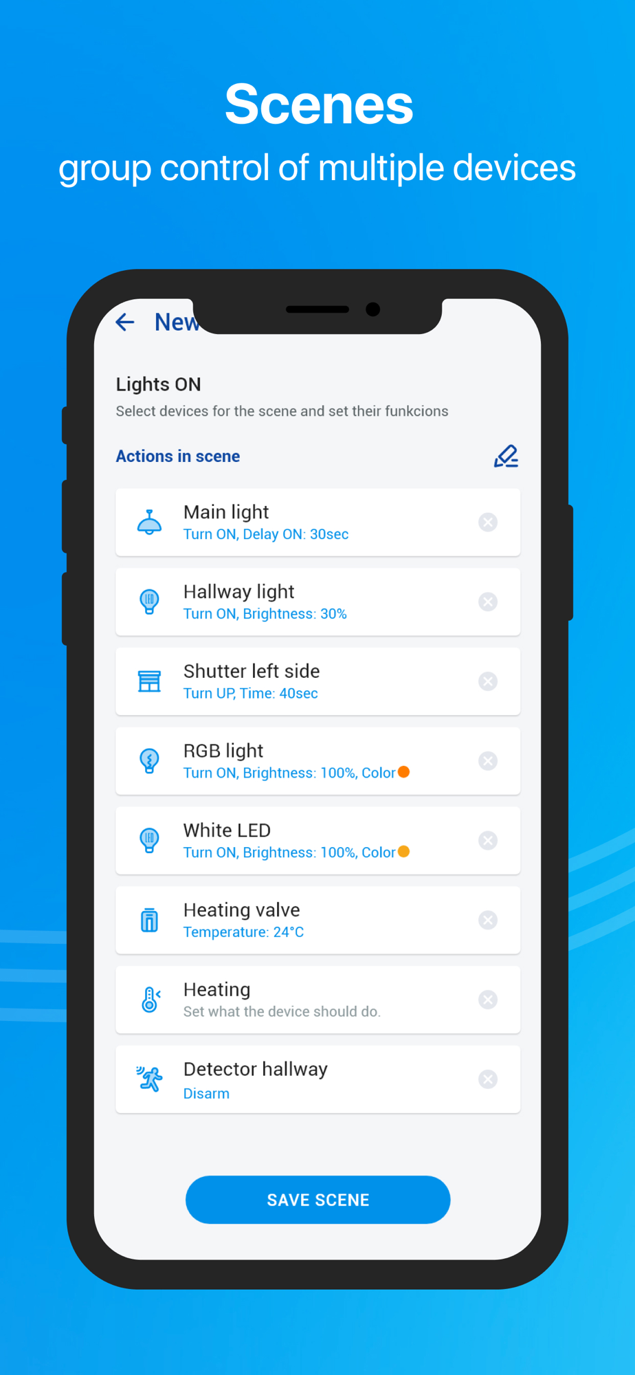 The application allows you to easily control connected devices such as socket switching, dimming of lights, control of blinds or garage doors, control of heating circuits. Of course, the display of available values, such as temperature, motion, window, door or flood detectors, or the current status of all controlled devices.