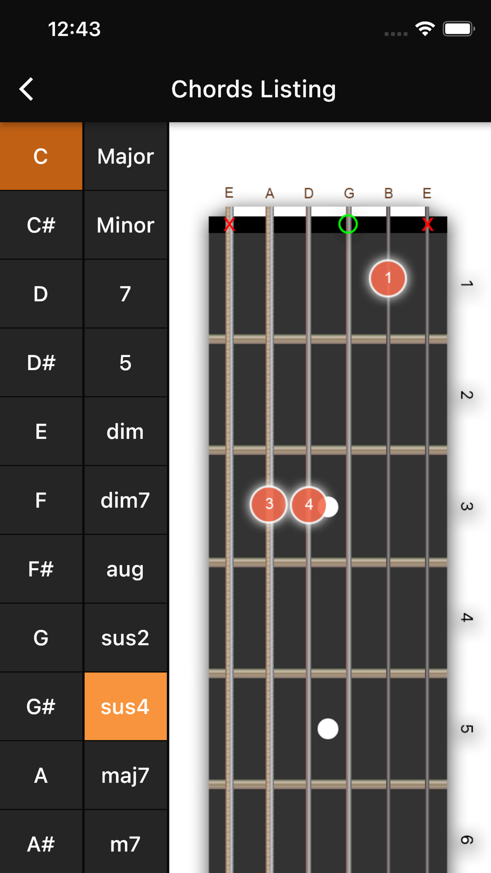 Standard chords list C, C#, D, D#, E, F, F#, G, G#, A, A#, B