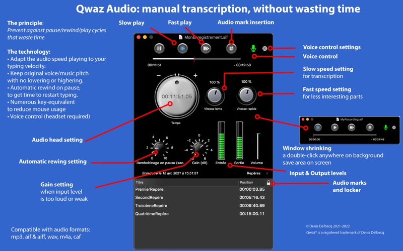 The application offer many features to help people transcribe with a maximum efficiency, such as Automatic rewind on pause —to be ready to restart in the best conditions—, audio markers insertion, etc. Qwaz Audio can be use next to any word processor. Once settings are made, all commands can be performed using key-equivalents to prevent from using the mouse and save time again.