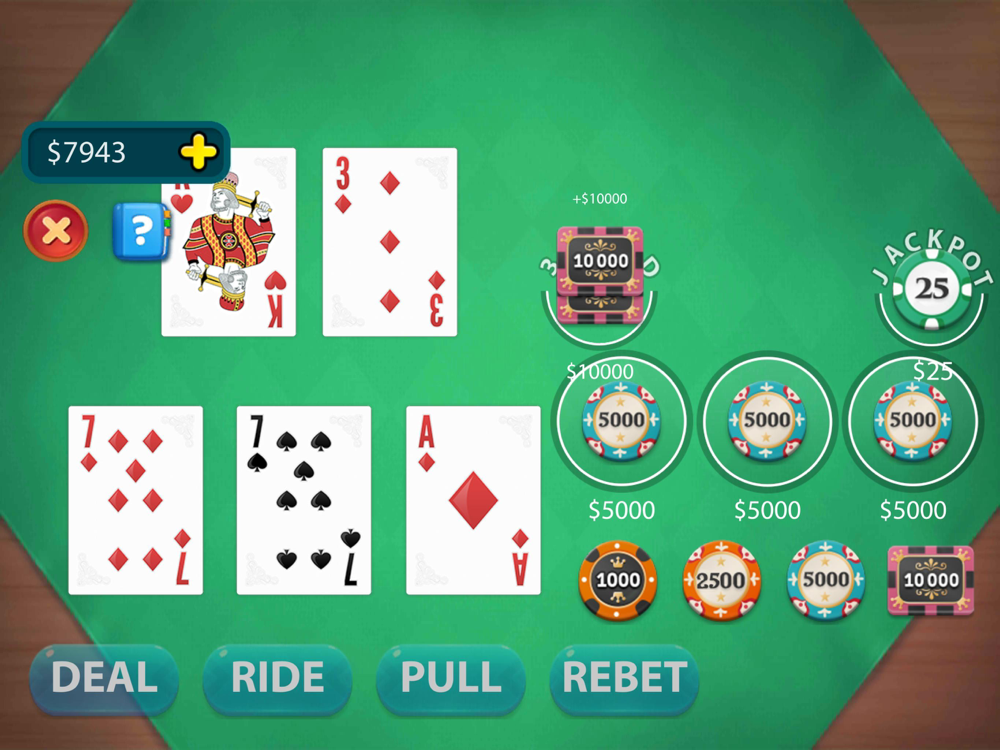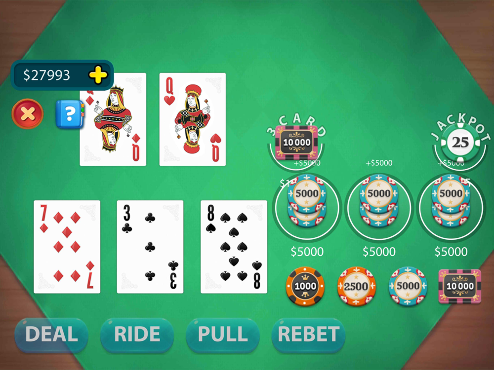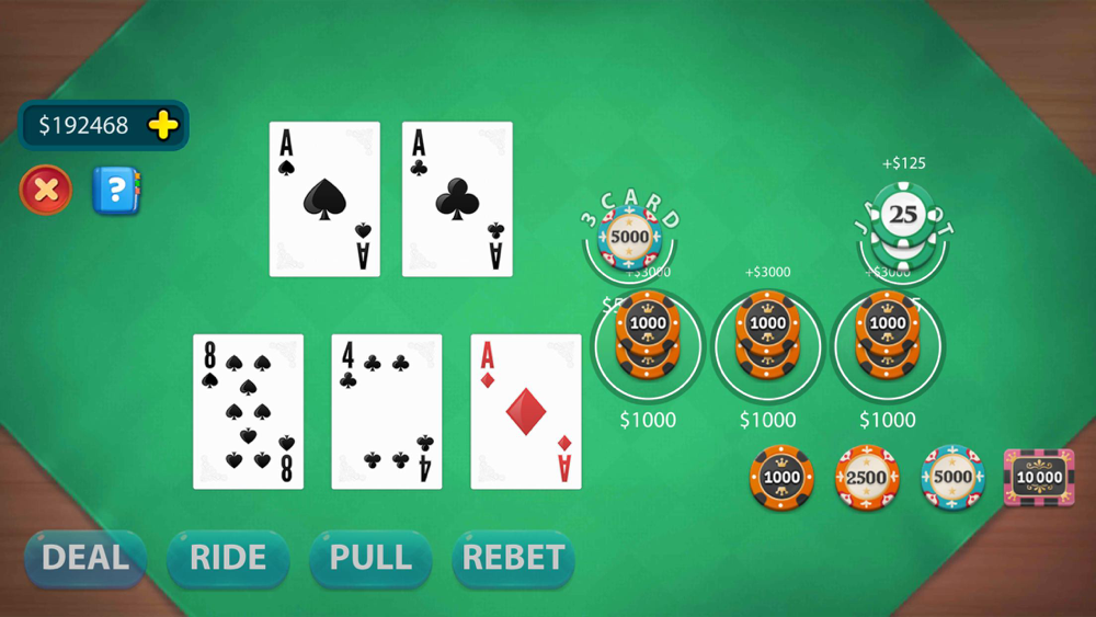 Let It Ride . Poker is a variation of five-card stud, based on three player cards and two community cards. The two community cards are initially dealt face down. The most distinguishing feature of Let It Ride . Poker is that the player is given two opportunities to withdraw exactly one-third of their initial wager. One chance occurs after the player looks at their hand but before the first community card is revealed, and the second occurs after the first community card is revealed, but before the second is revealed. The player may reduce their wager on either of these occasions, or on both, or neither. If the player decides not to withdraw part of their wager, they are said to "let it ride" In order to ensure that the player's initial wager is divisible by three, each player must distribute their wager over three betting spots which must all contain the same chip value. On some table layouts these spots are given the symbols 1, 2 and $, with 1 and 2 indicating the thirds of the wager which the player can withdraw before the first and second community cards respectively are turned up, and $ representing the third of the wager which there is never a chance to withdraw.