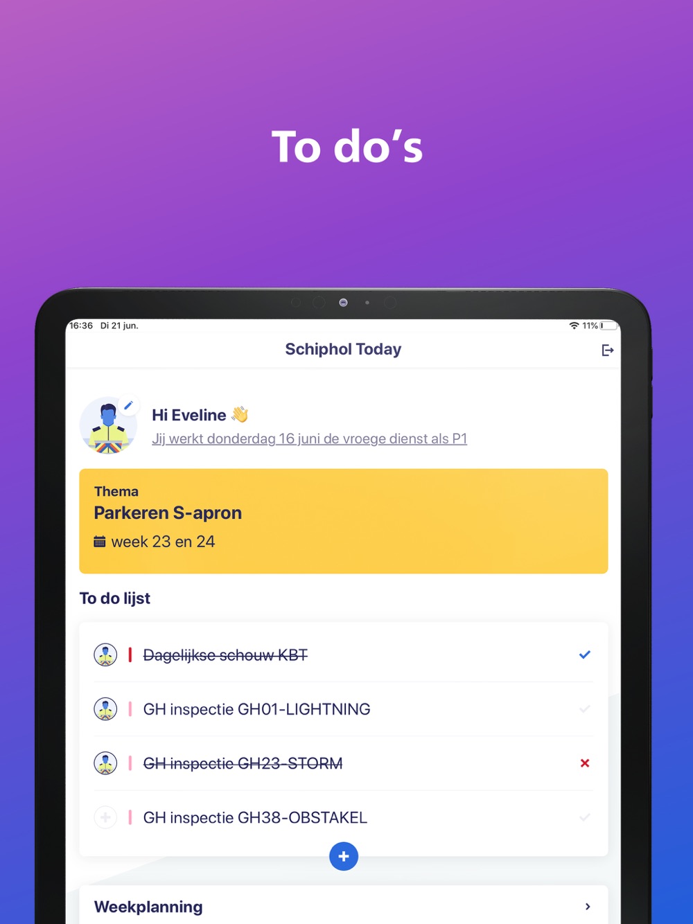 Schiphol Today is the app for Schiphol airports mobile workforce. It provides a single point of acces for all work-related information and tasks.