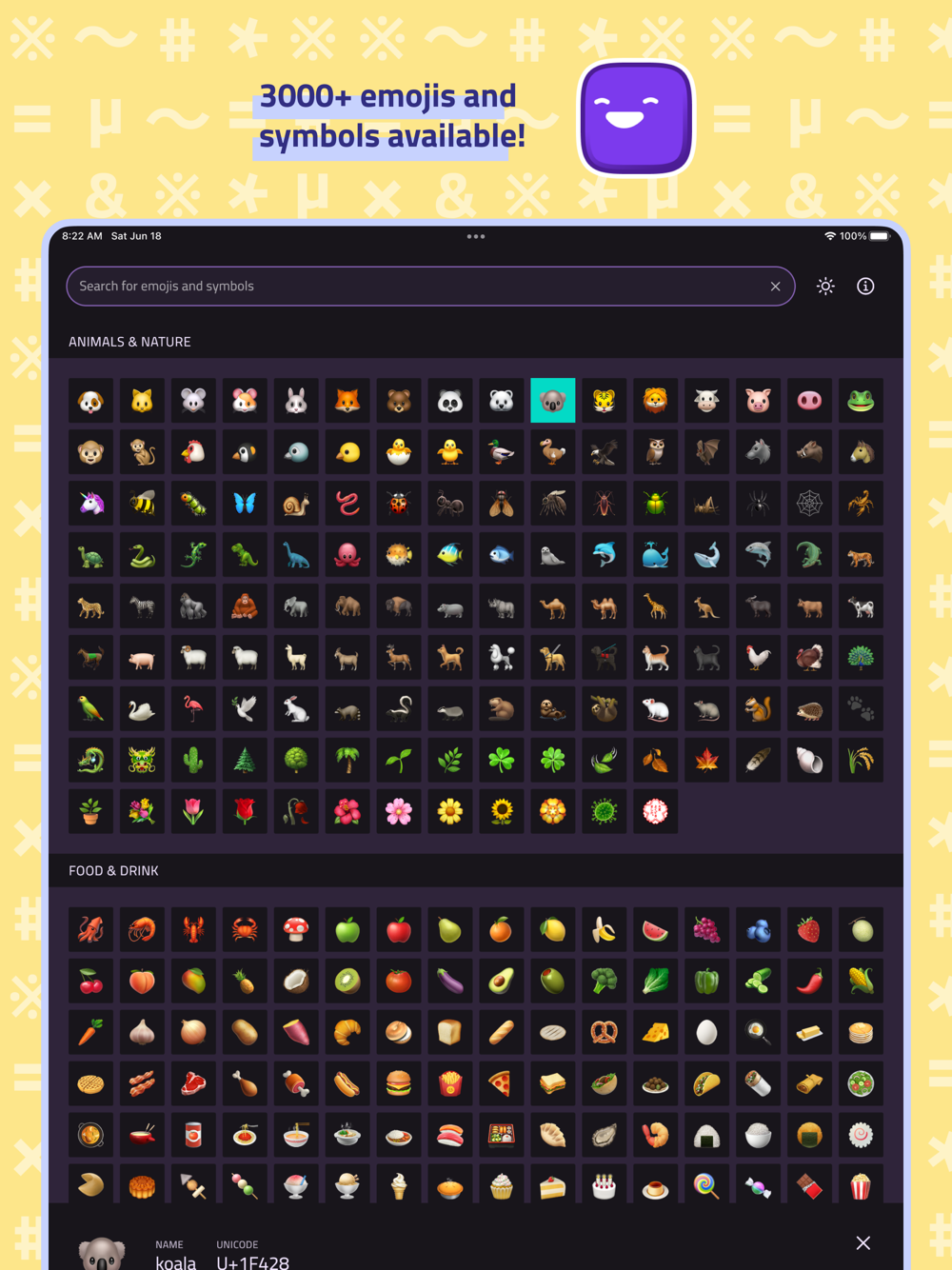 1800+ emojis and 17000+ symbols available: smileys, people, animals, food, objects, arrows, letters,