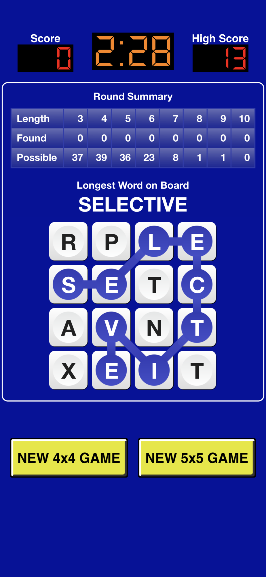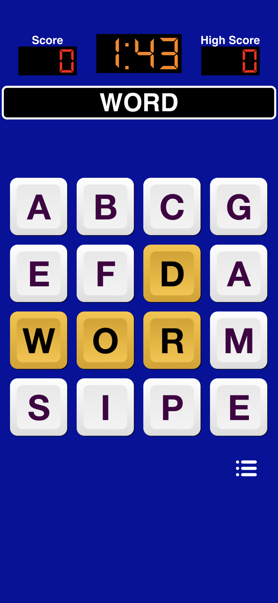 This game presents you with a grid of 4x4 or 5x5 of letters. Spell words by swiping the letters. Spell as many words as you can before time runs out.