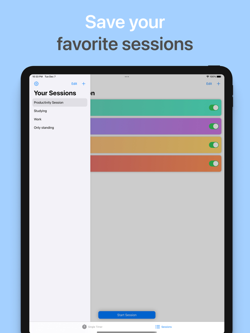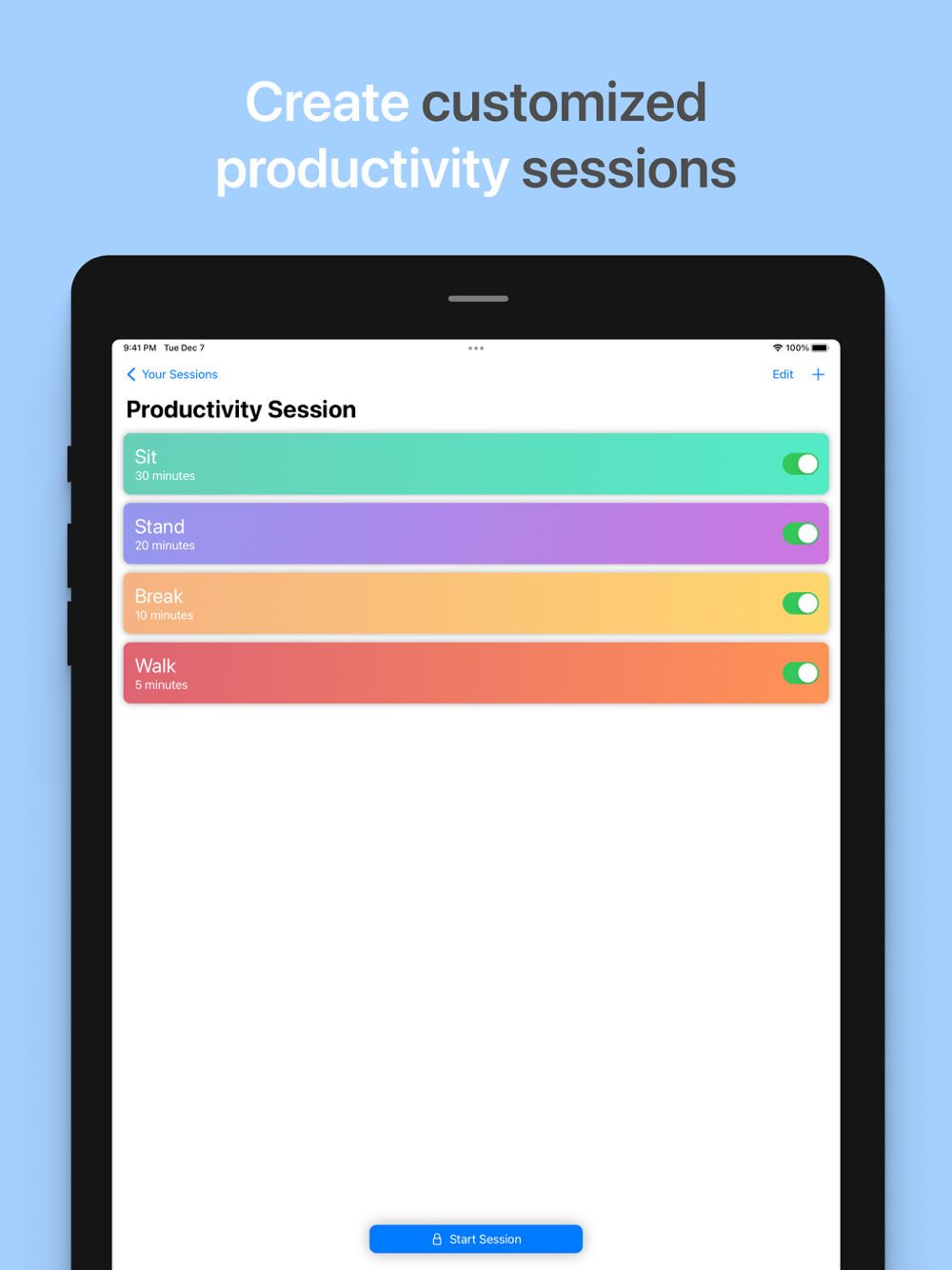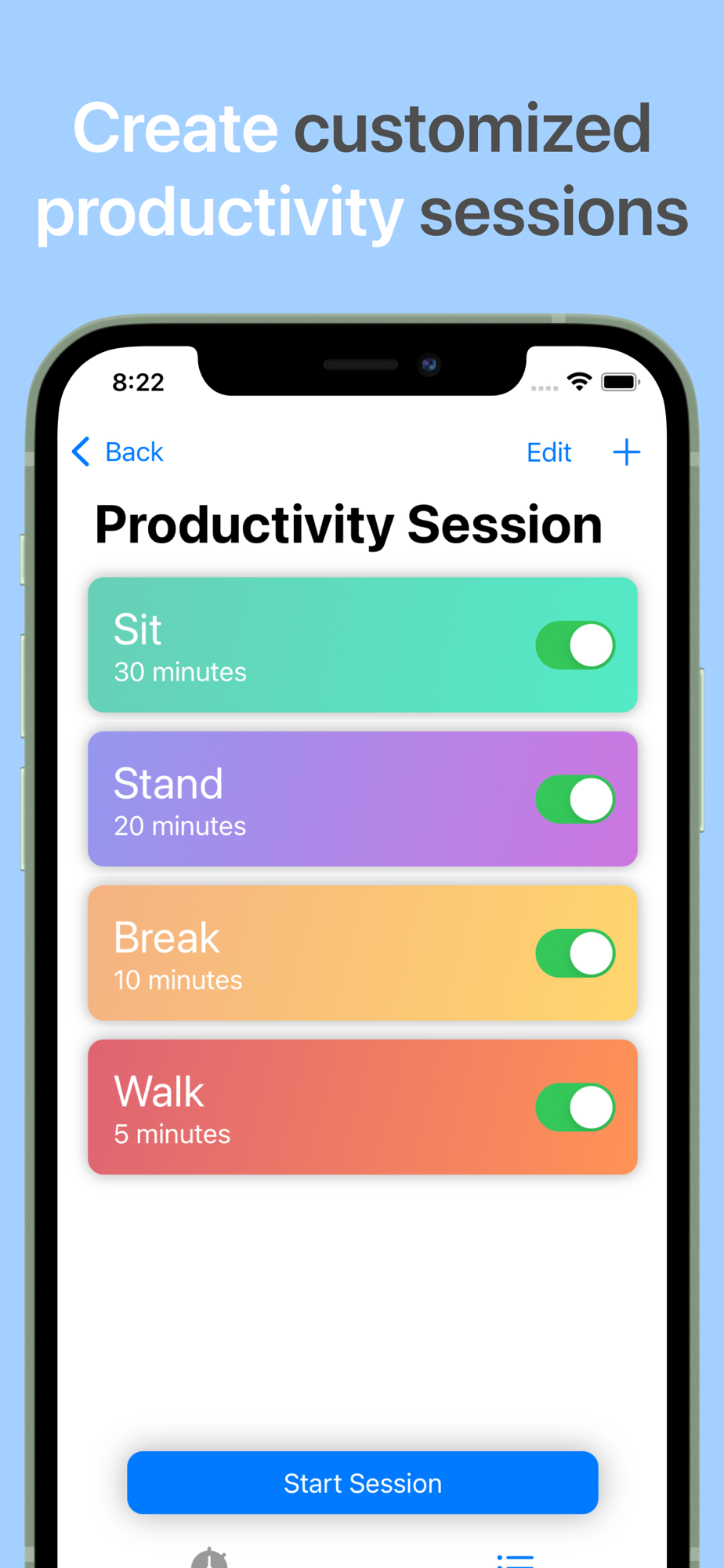 To help you, Ergo Focus allows you to set up customizable work sessions so you can plan your whole work day or study session ahead and have Ergo Focus guide you through it.
