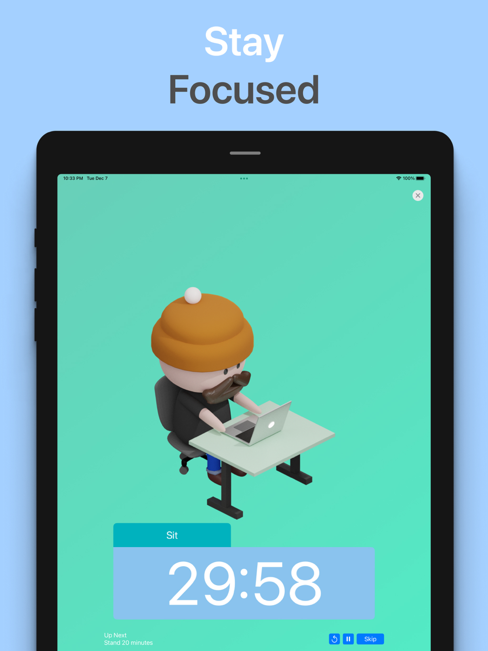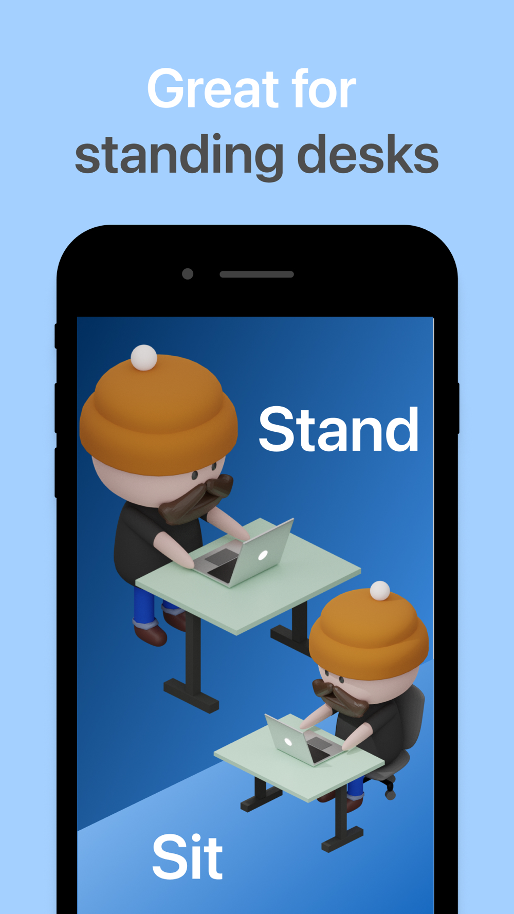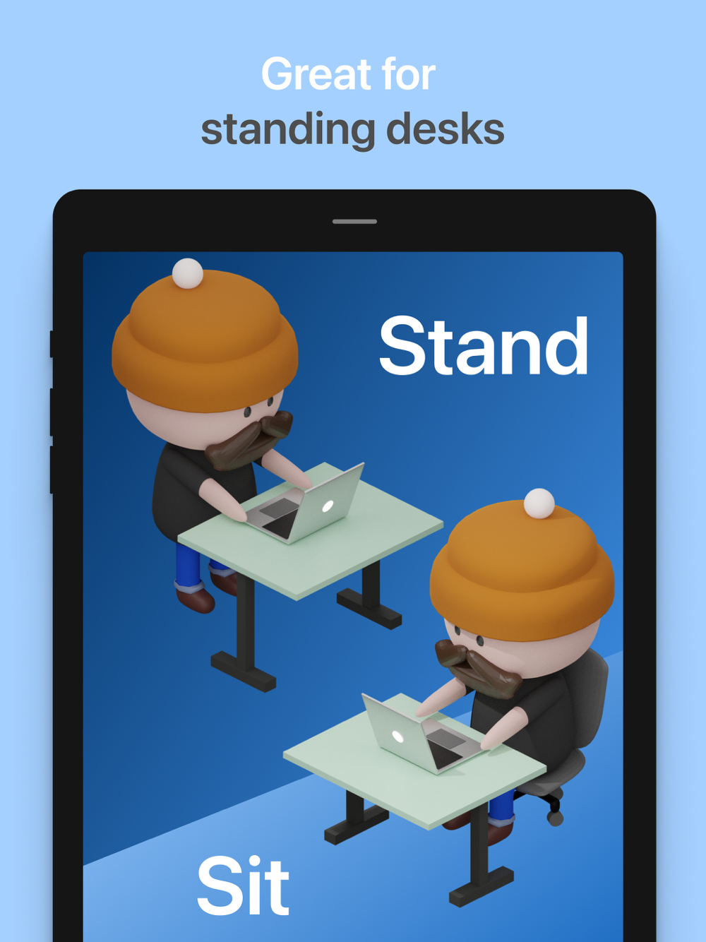 With Ergo Focus you can set yourself clear timed reminders to alternate between different positions throughout the day as you work, and not only when you take a break. Whether it's with a standing desk, or simply by standing up with your laptop at an elevated counter for a little while, you'll drastically cut down on the amount of time you stay in the same position in a day. Building habits like this will greatly reduce the negative effects of sitting at a desk while working all day.