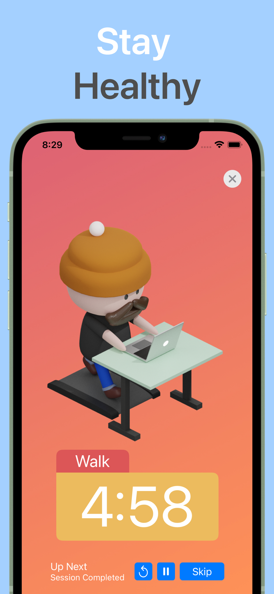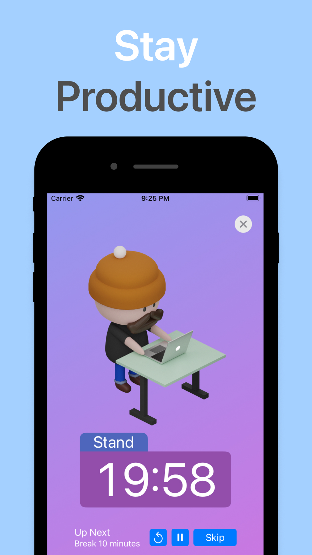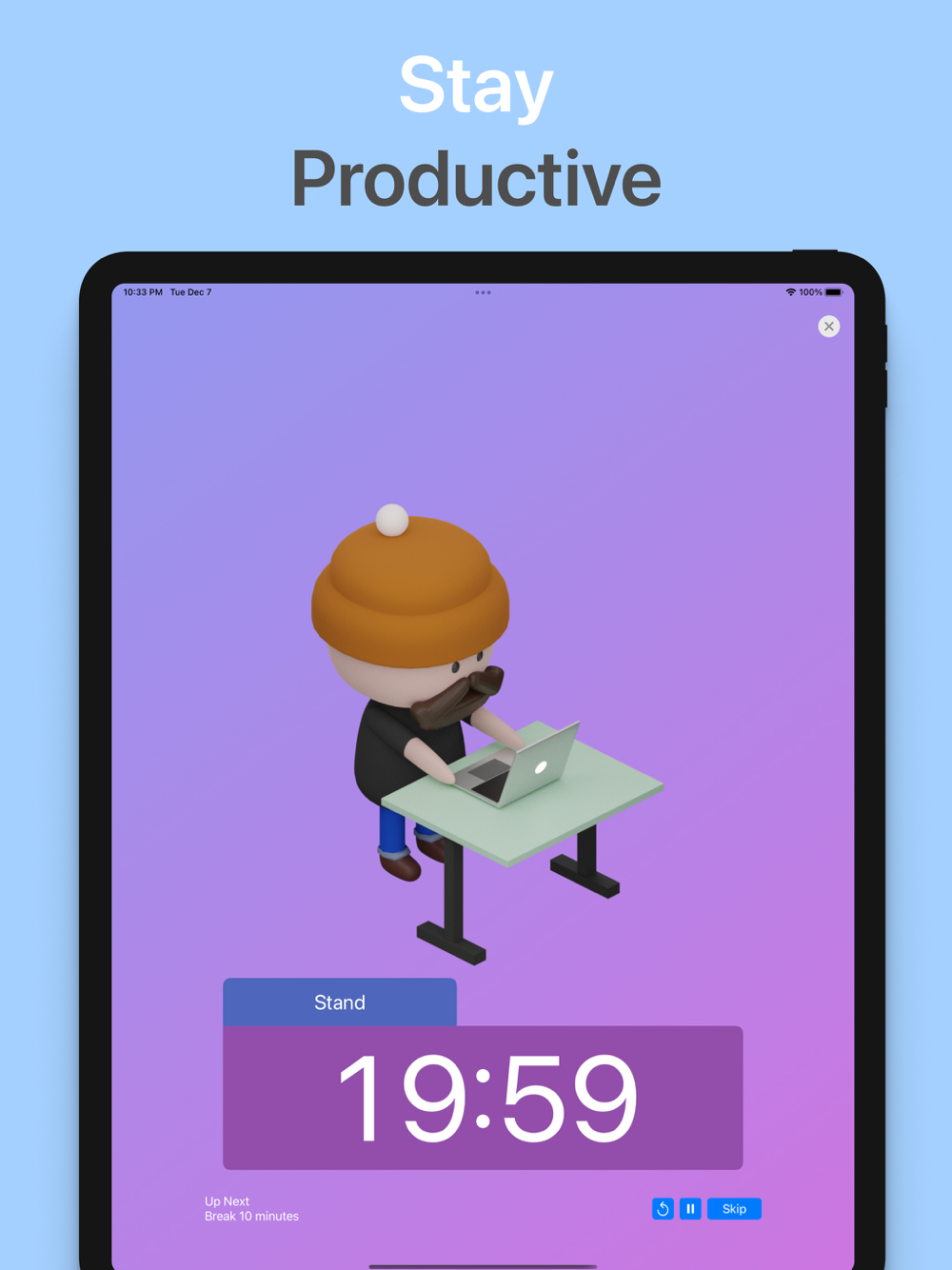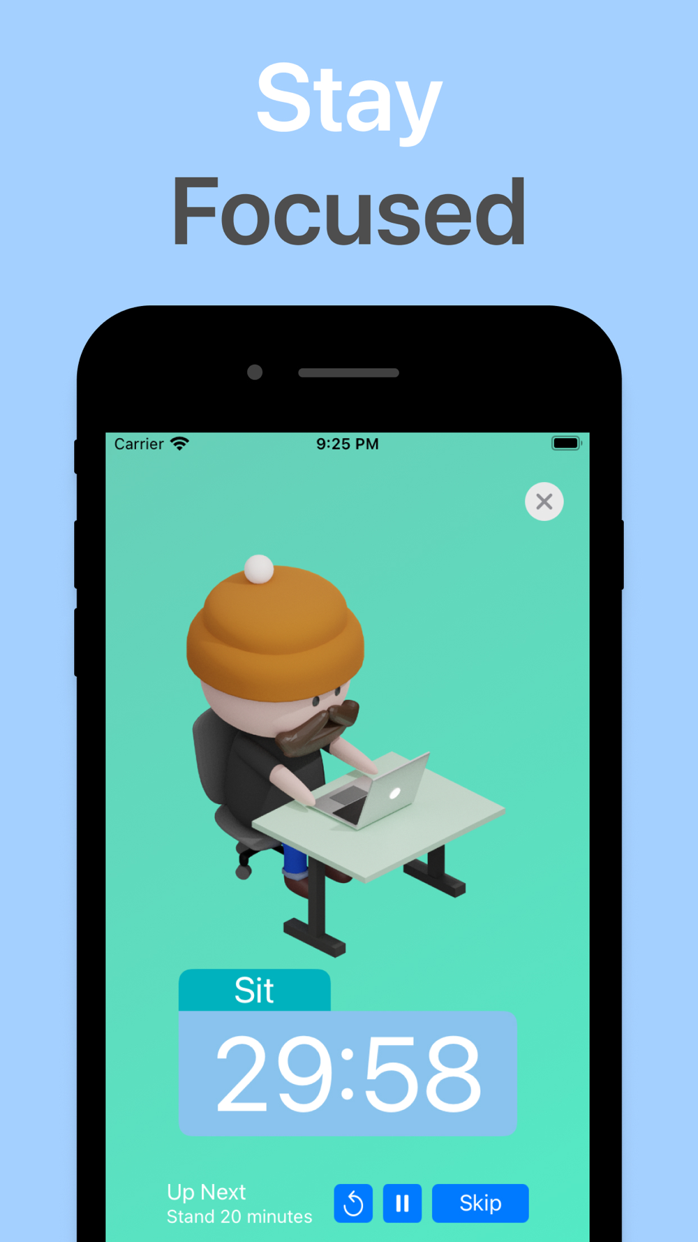 With Ergo Focus you can set yourself clear timed reminders to alternate between different positions throughout the day as you work, and not only when you take a break. Whether it's with a standing desk, or simply by standing up with your laptop at an elevated counter for a little while, you'll drastically cut down on the amount of time you stay in the same position in a day. Building habits like this will greatly reduce the negative effects of sitting at a desk while working all day.