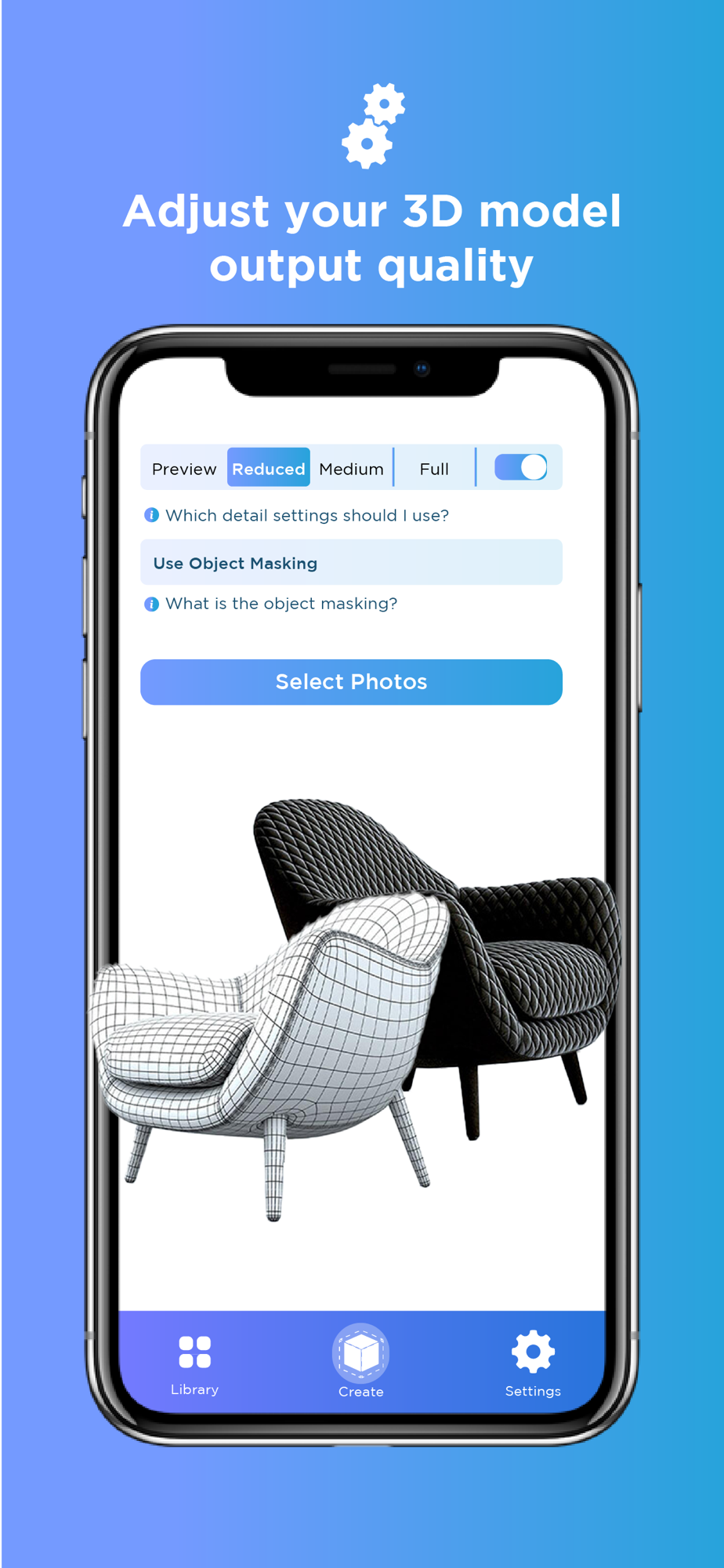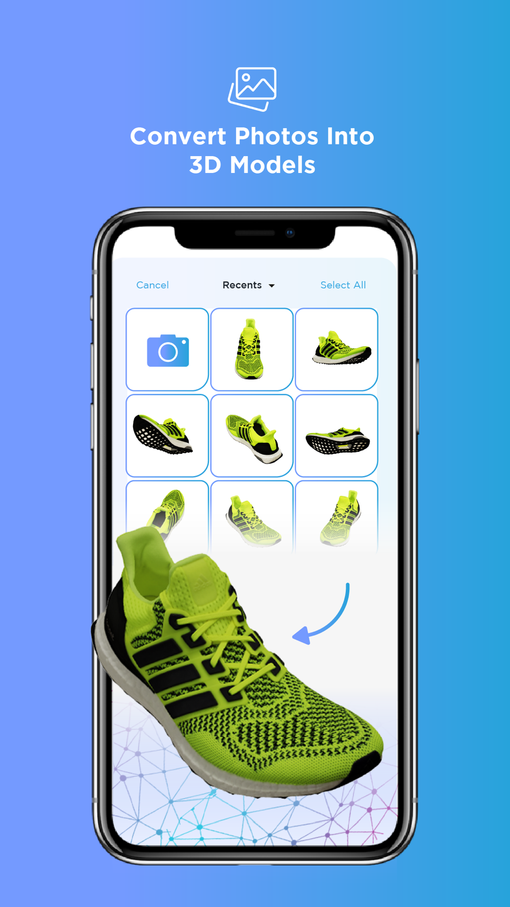 HoloNext 3D Scanner app allows you to create your own 3D models from photos. Select photos from your gallery and create your 3D models automatically. With the HoloNext seamless Augmented Reality (AR) cloud platform, you can also view and share your 3D models in AR mode through mobile and Web browsers.