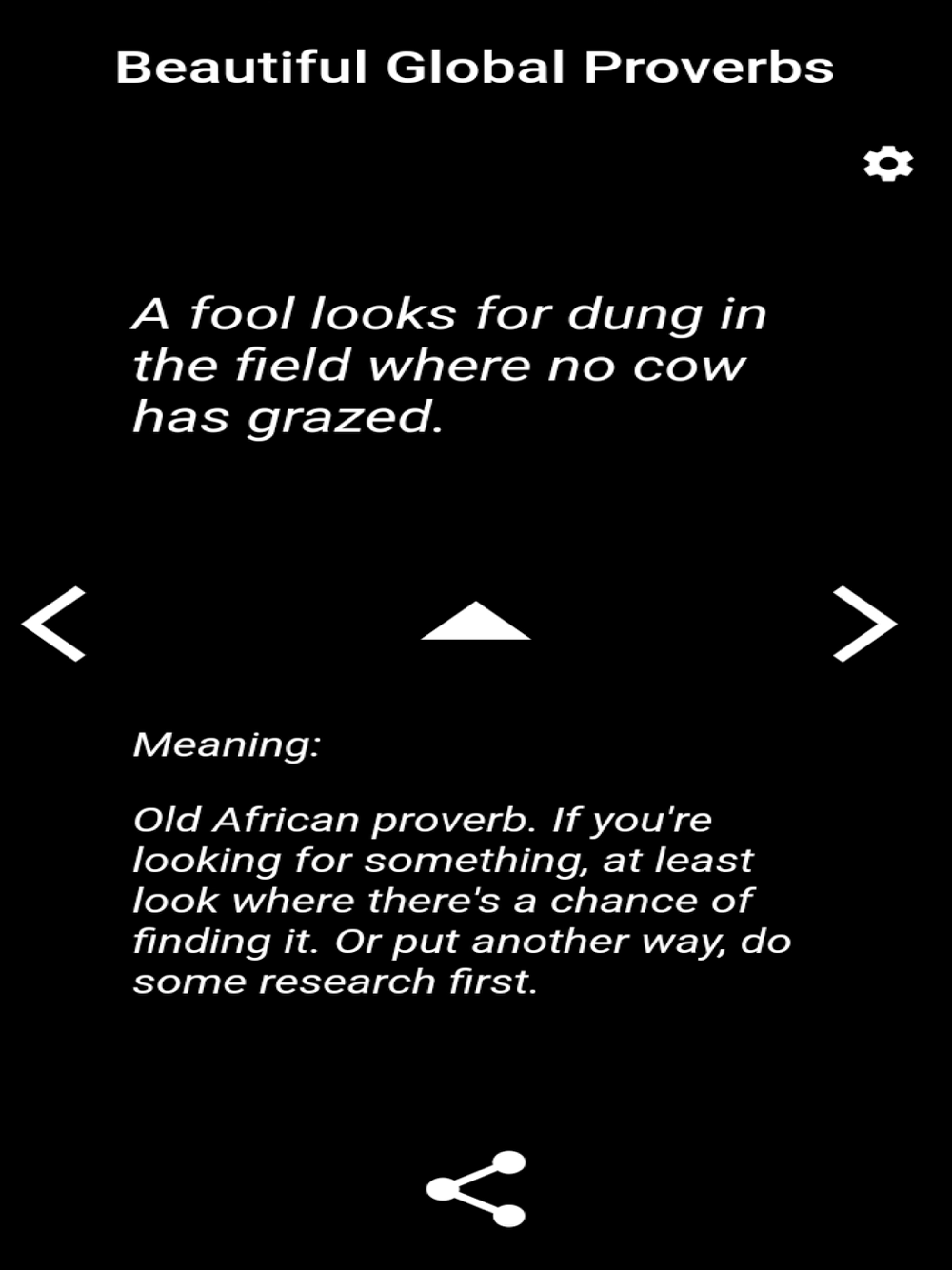 Super simple light app, just two pages. Displays a new proverb from around the world every day along with its meaning. Can also browse all previous proverbs, can share proverb with friends and can set a daily pop-up notification if you wish.