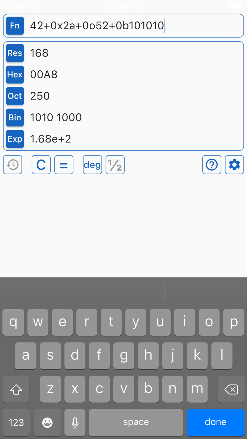 42+0x2a+0o52+0b101010, Result: '168' - basic arithmetic functions and ability to enter in different number bases.