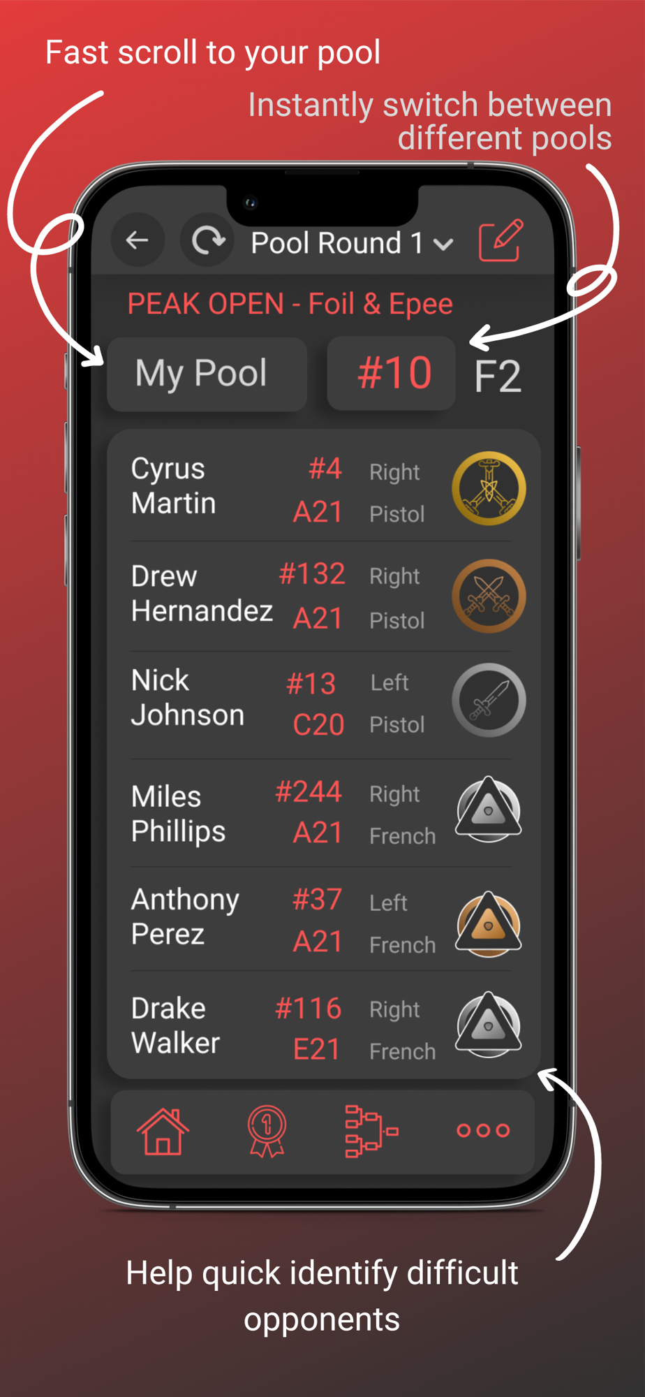All combined within a single mobile application for ease of use and quick navigation that includes an adaptable navigation bar at the bottom to allow for instant movement between pools, DEs, final results, etc. from any screen.