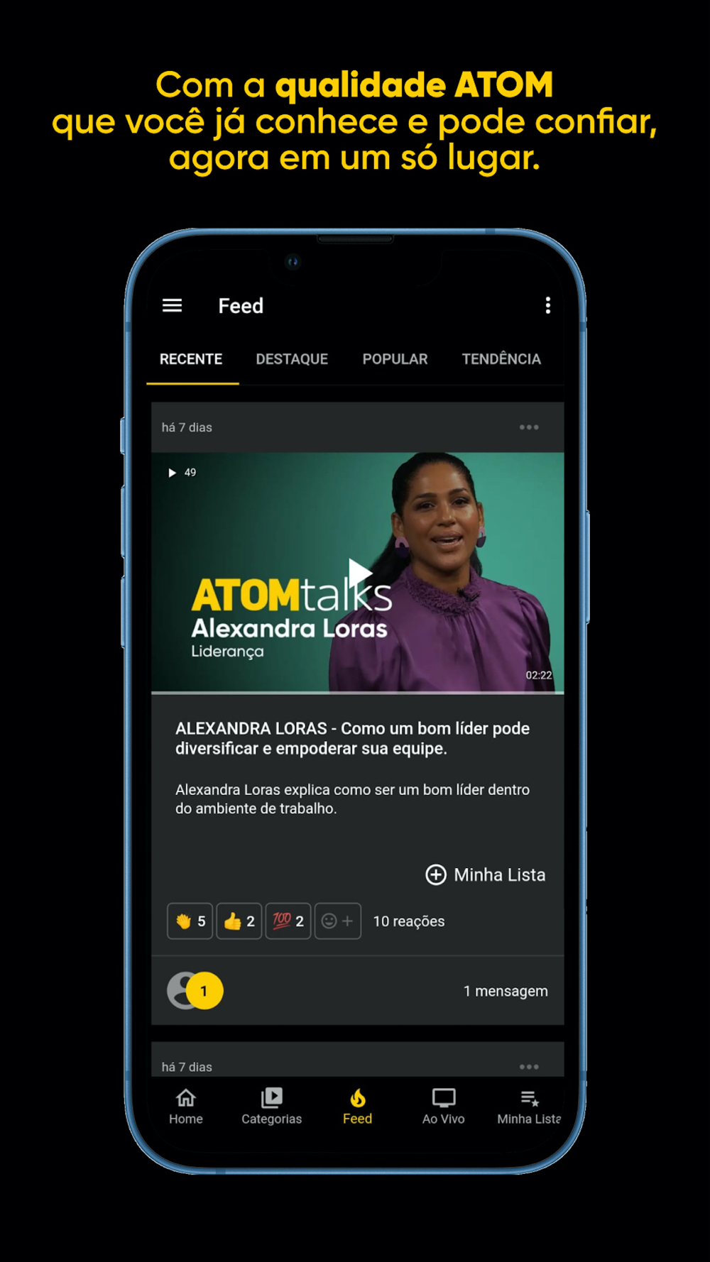 No Atom TV tenha acesso a mais de 10 categorias exclusivas de entretenimento, como Realities, Lifestyle, Saúde Mental, Esportes, E-sports, acesso à programação AO VIVO de segunda à segunda e muito mais!