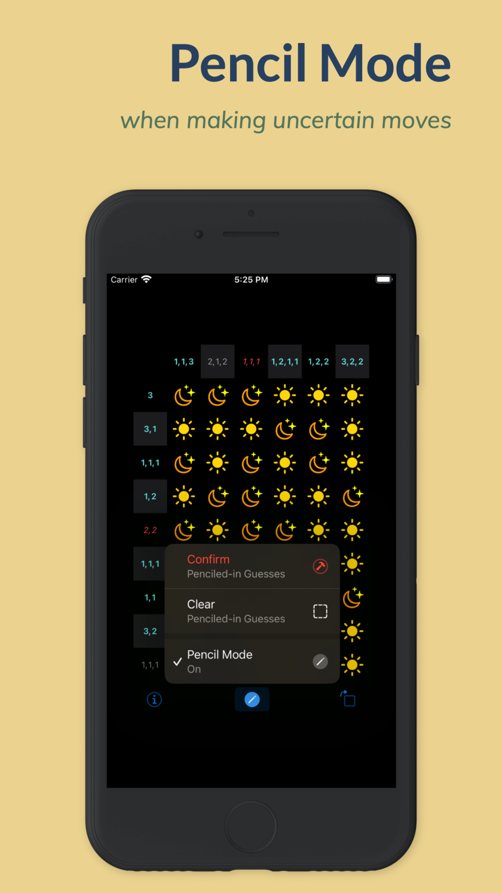 - The clue tells you how many on's are on that row or column, and whether they are together or apart.